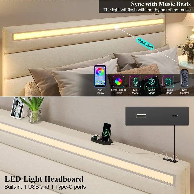Customizable Ambiance: The headboard features RGB LED lights with 60,000+ colors, adjustable via app or smart controller, to create the perfect ambiance for any occasion.