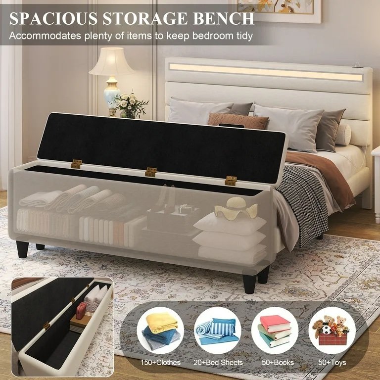 Versatile Storage: The storage bench at the end of the bed offers ample space for seasonal clothing and can double as a shoe bench or coat holder, enhancing bedroom organization.
