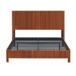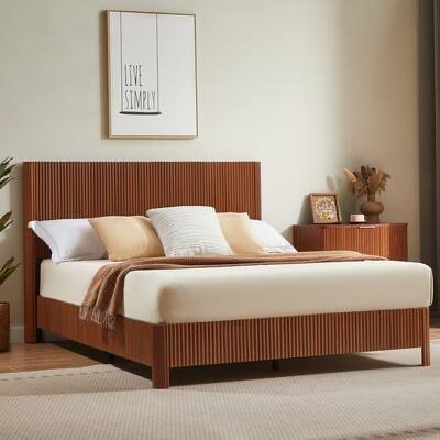 The bed frame showcases a modern curved profile with rustic corrugated wood accents, creating a blend of farmhouse charm and contemporary style. This timeless design adds subtle visual interest and complements any bedroom decor seamlessly. Rounded corners with wood ripples enhance safety by preventing accidental bumps.
