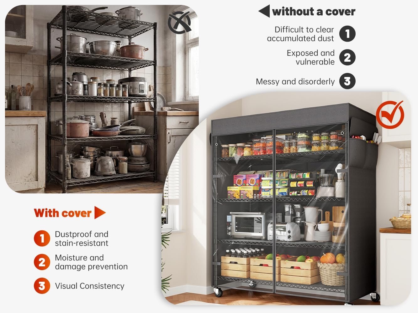 【1100LBS Metal Shelving】The wire shelving unit measures 45Wx17.72Dx72.83H with wheels for easy mobility, the pantry shelving consists of five tiers total load capacity is 1100lbs (265lbs on wheels). And there are pockets on the side of the cover for storing small and frequently used items