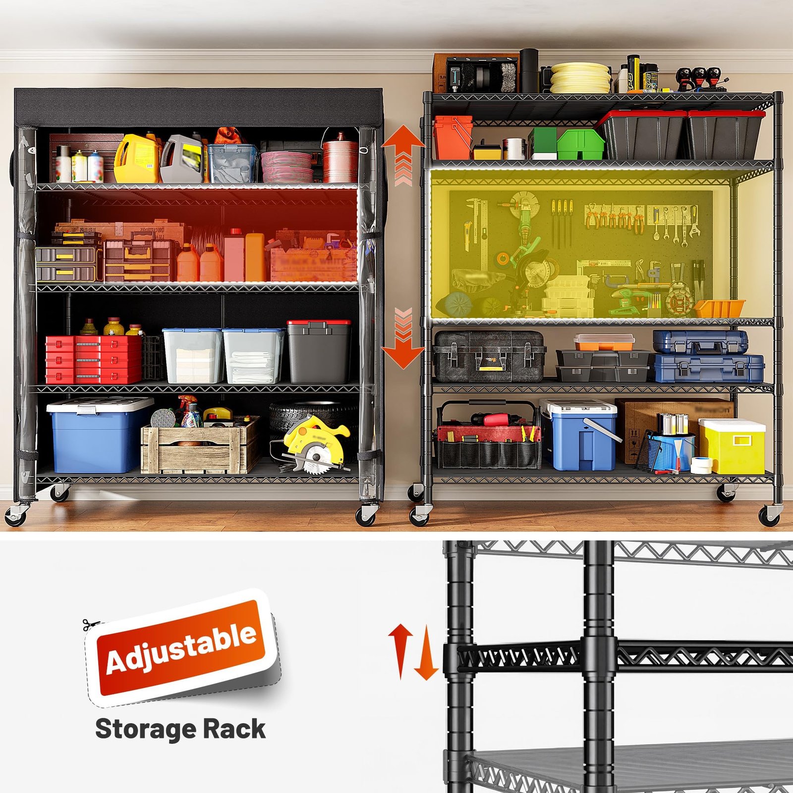 【Upgraned 2-in-1Garage Shelving Design With Cover】The metal shelves with cover, protects your shelves and items from UV rays, water, dust, and dirt. The front and back panels are designed with two-way T-zippers and side zippers for easy access and can be secured inside and out with Velcro or ties.