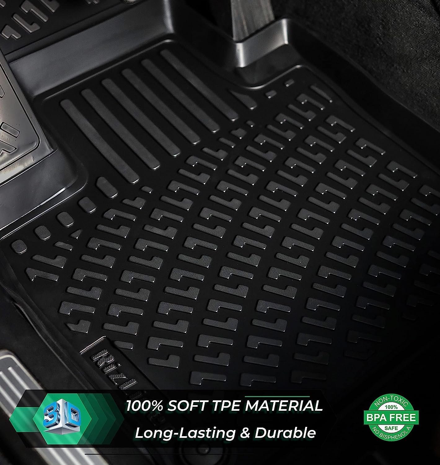[ EASY TO INSTALL & CLEAN ]: The textured skid-resistant surface provide cleaning by only shaking them out or spraying them down with a hose. Installation is very simple. Since it is produced from very soft and natural TPE material, it may take up to 48 hours for the mats to take the shape of the car floor.