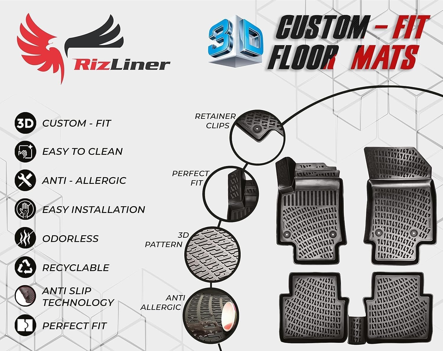 [ PRECISE FIT ]: RizLiner floor mats liners using 3D laser scanning technology ensures perfect fit to the car trunk floor with custom design.