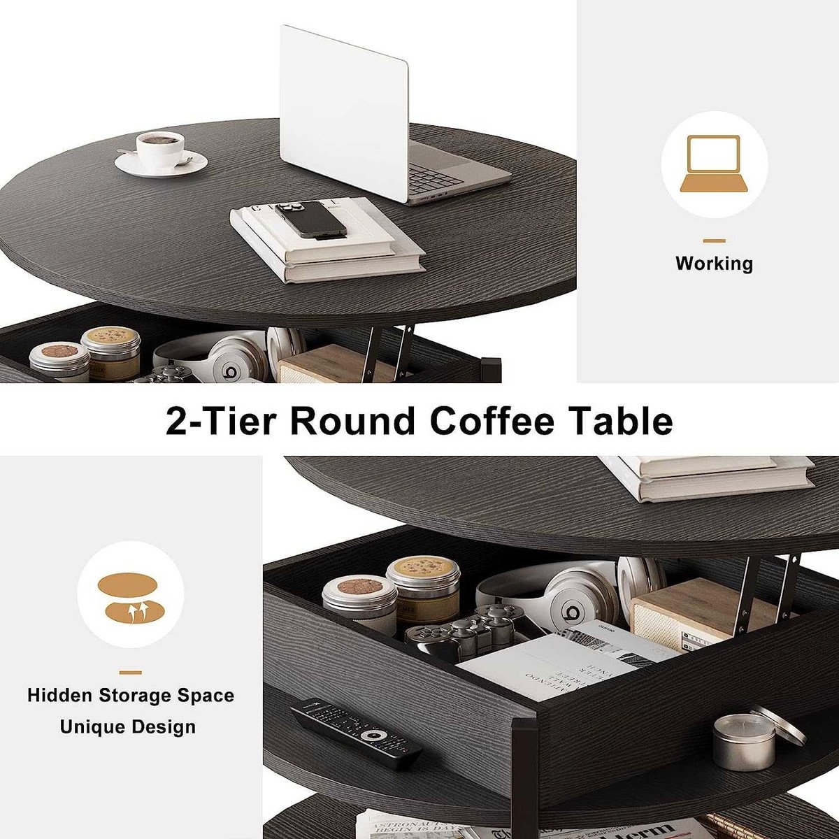 DescriptionFABATO Round Lift Top Coffee Table with Storage and Hidden Compartment, 35.43” Farmhouse Coffee Table for Living Room Reception Room, 2 Tier Large Round Coffee Table Round Dining Table, Black
