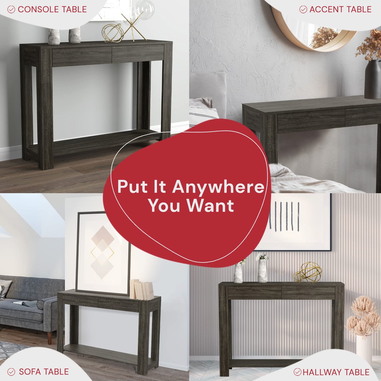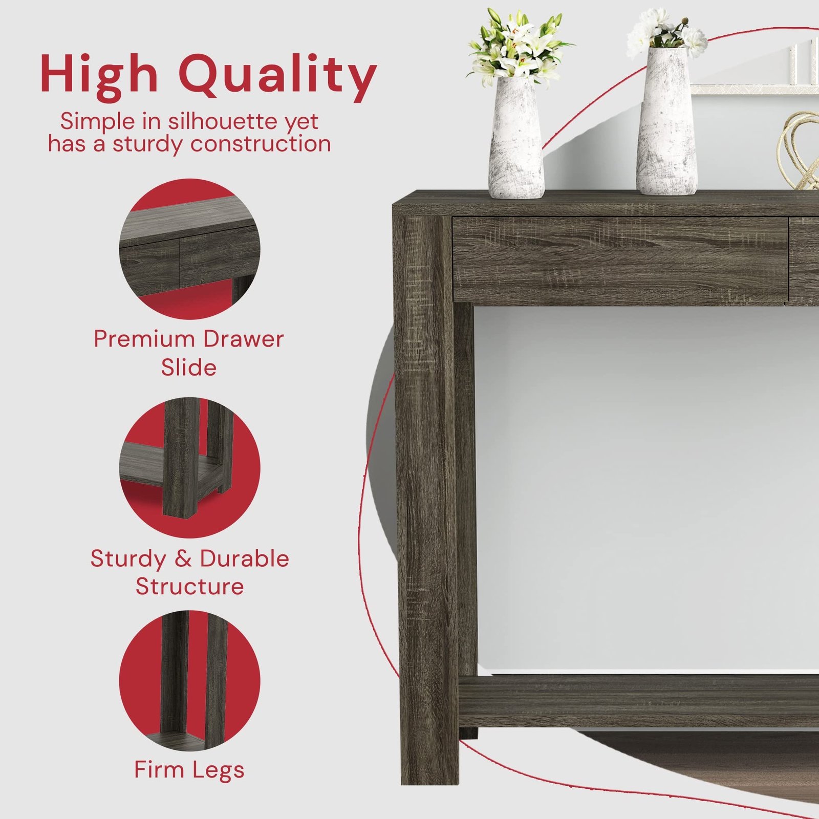 Easy to Assemble – Every purchase of our hallway table with drawers includes an easy-to-follow instruction manual. Get your decorative tables for entryway today!