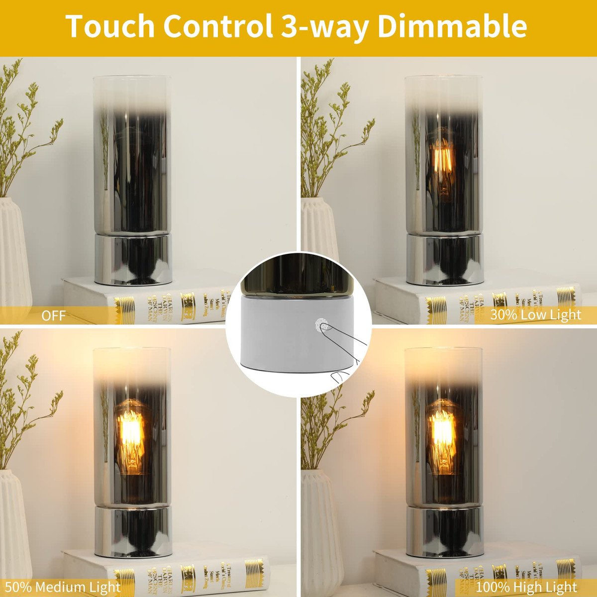 ?3-Way Dimmable Touch bed Lamp?This small side table lamp has 3-level brightness, you can quickly turn on/off and adjust the brightness by simply tap anywhere on the silver base. Nightlight for a steady sleep or nursing. Accent lamp for warm mood. Proper high comfortable brightness for studying or working.
