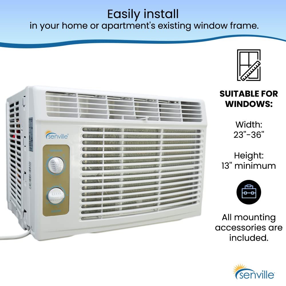 DescriptionSenville?s 5,000 BTU Window Air Conditioner is a compact and powerful air conditioning unit. This unit is an efficient and affordable option that easily cools rooms up to 150 sq. ft. in size. You can choose from 7 temperature settings, 2 cooling speeds, 2 fan-only speeds, and direct the air with the 2-way outlet to meet your needs.