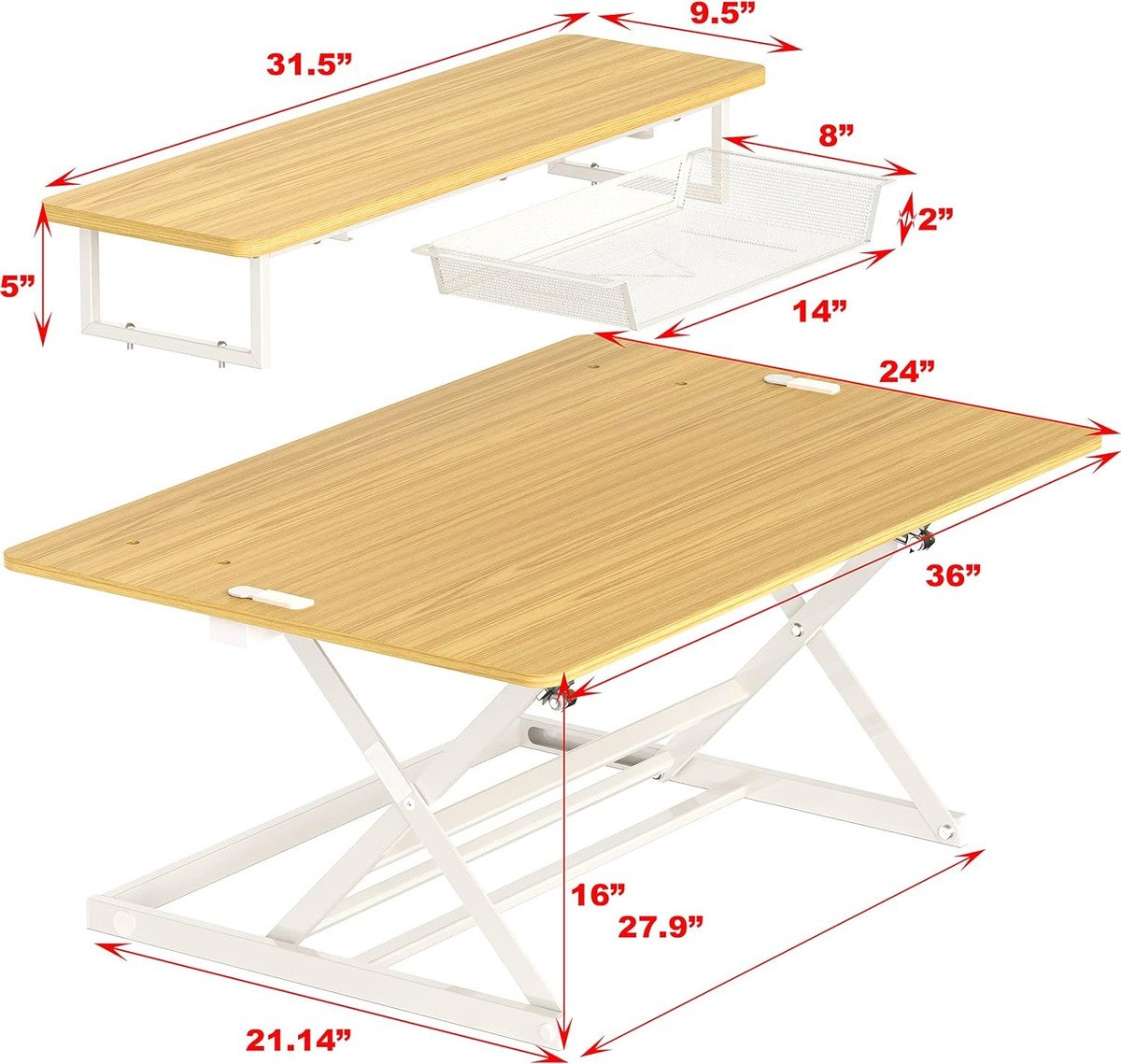 Dimension: 36″ W x 24″ D x 4″- 16″ H (91.4 cm W x 61.0 cm D x 10.2 cm ~ 40.6 cm H Base foot print is 26″ W x 21″ D (66.0 cm W x 53.3 cm D) perfect for small desks.