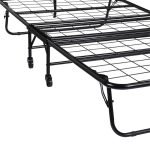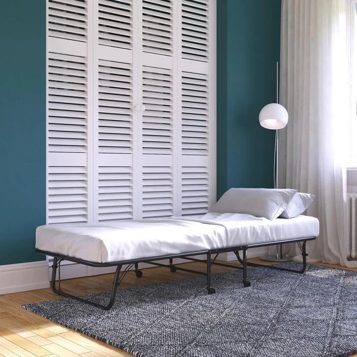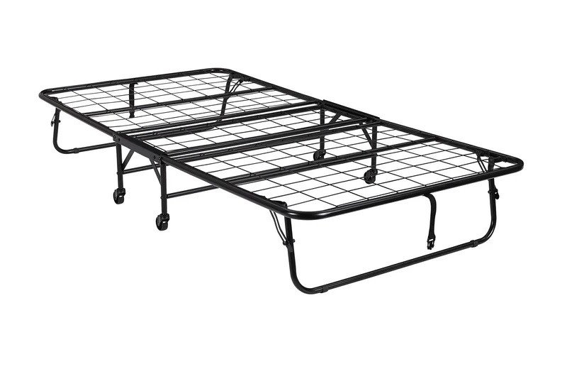Foldaway sturdy twin-size metal frame neatly folds up and tucks away in closets when not in use. Metal mesh base for added comfort and durability. ?Convenient space-saving design fits in almost any room size.