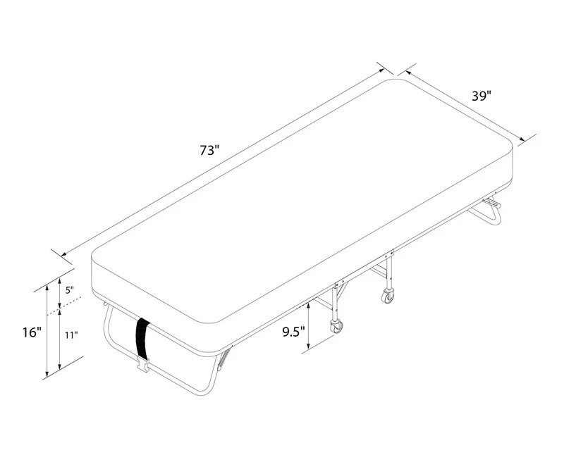 Dimensions (open): 74″L x 37″W x 16″H. Clearance from floor to mattress: 9.5”. Dimensions (closed): 38.5″L x 14″W x 44.5″H. Weight limit: 225 lbs. Net weight: 32 lbs. Shipping dimensions: 39″L x 36″W x 12.5″H. Gross weight: 44 lbs.