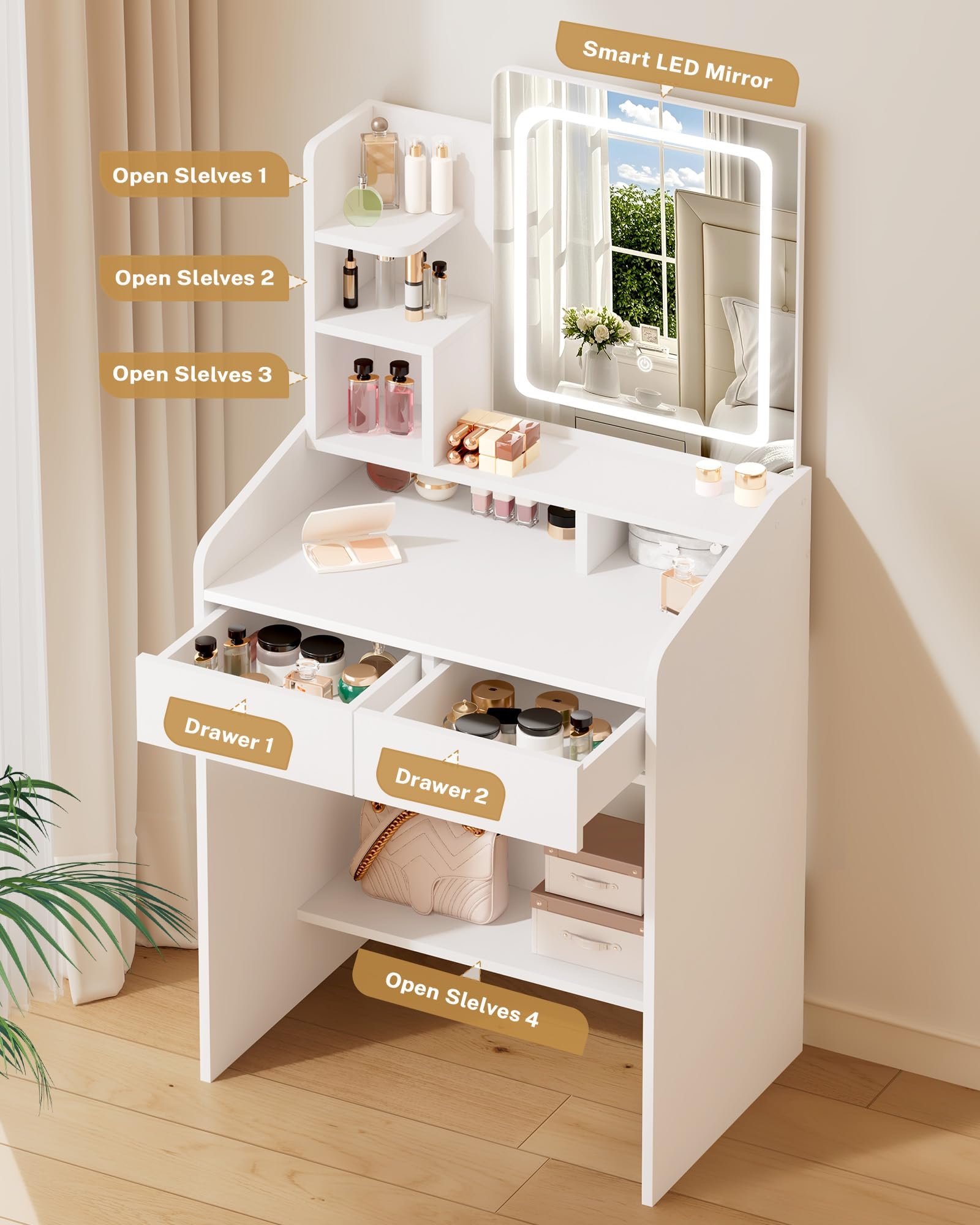 【Why choose LIVELYGLOW?】: Makeup Table measures 23.62”D x 15.74”W x 53.93”H, providing a space-efficient and compact solution for your beauty and grooming needs. LIVELYGLOW makeup vanity includes 2 drawers, 3 storage shelves, and 2 closed storage partitions, 1 large bottom bag rack, providing ample space for organizing all your cosmetics, skincare products, jewelry, hair straighteners, and hairdryers.
