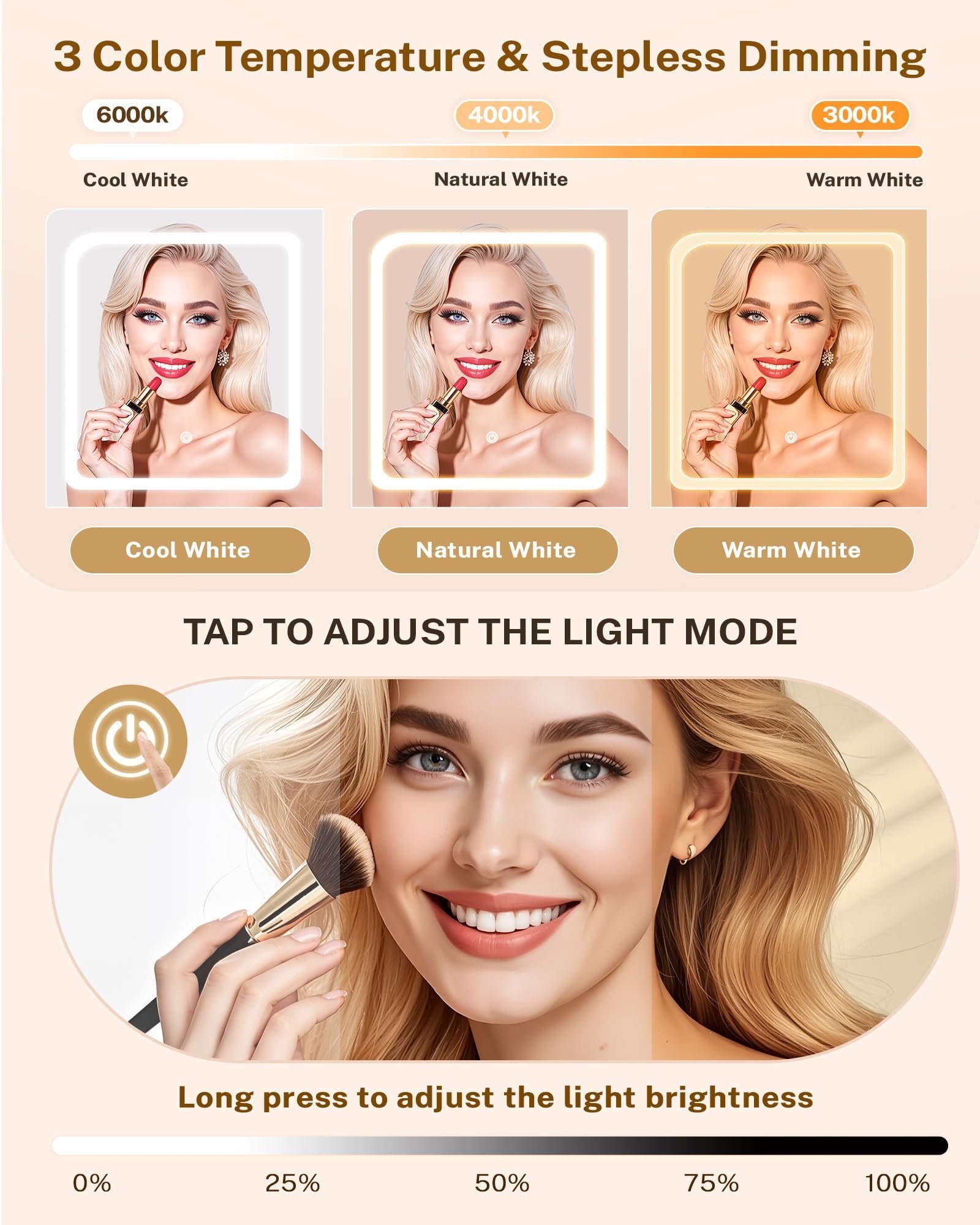 【Adjustable LED & Touch Sensor Lighting】Customize your vanity experience with adjustable LED strip lights, which offer three distinct lighting modes: warm, natural, and cool. Easily adjust the brightness levels with a touch-sensitive control panel.