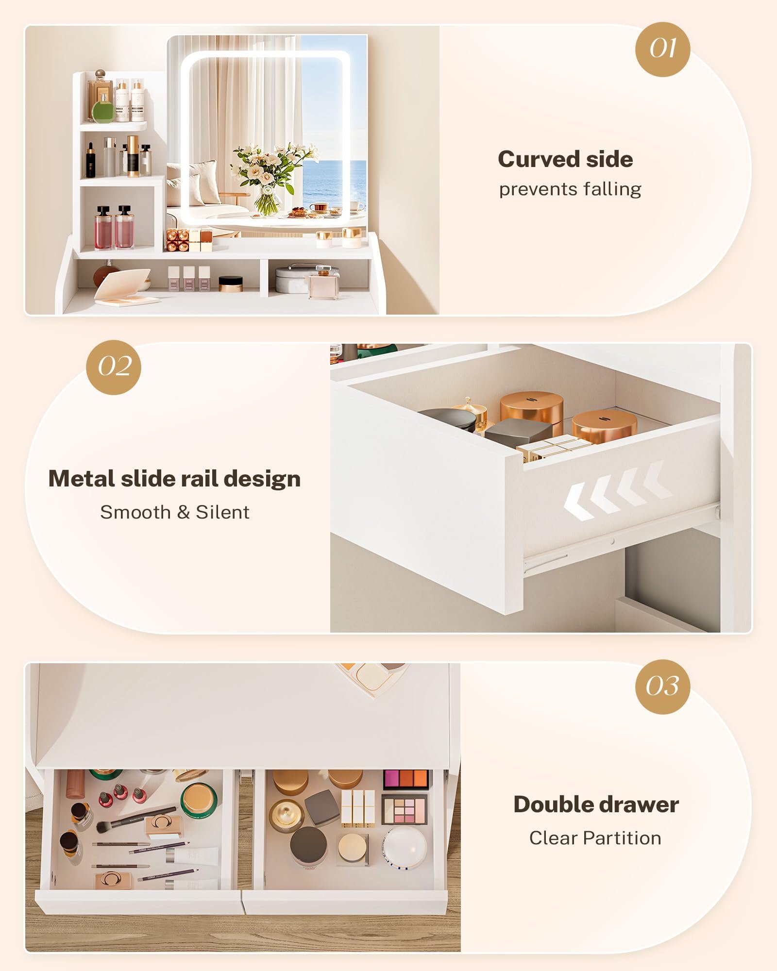 【Unmatched Stability】Experience unparalleled stability with LIVELYGLOW vanity makeup table, supported by both the sturdy cabinet and the robust plate design. This dual-support system ensures wobble-free performance, allowing you to indulge in your beauty routine with confidence and peace of mind.