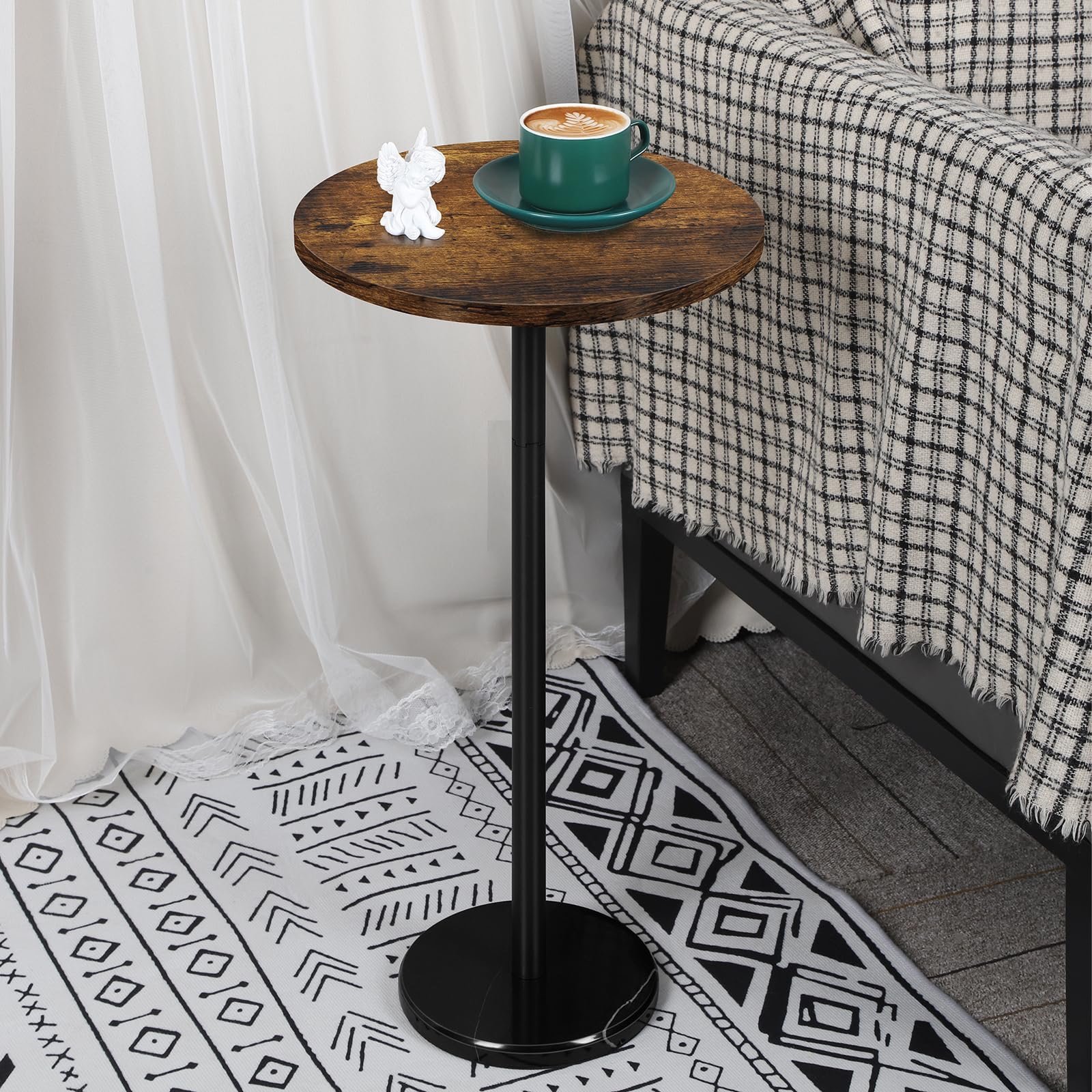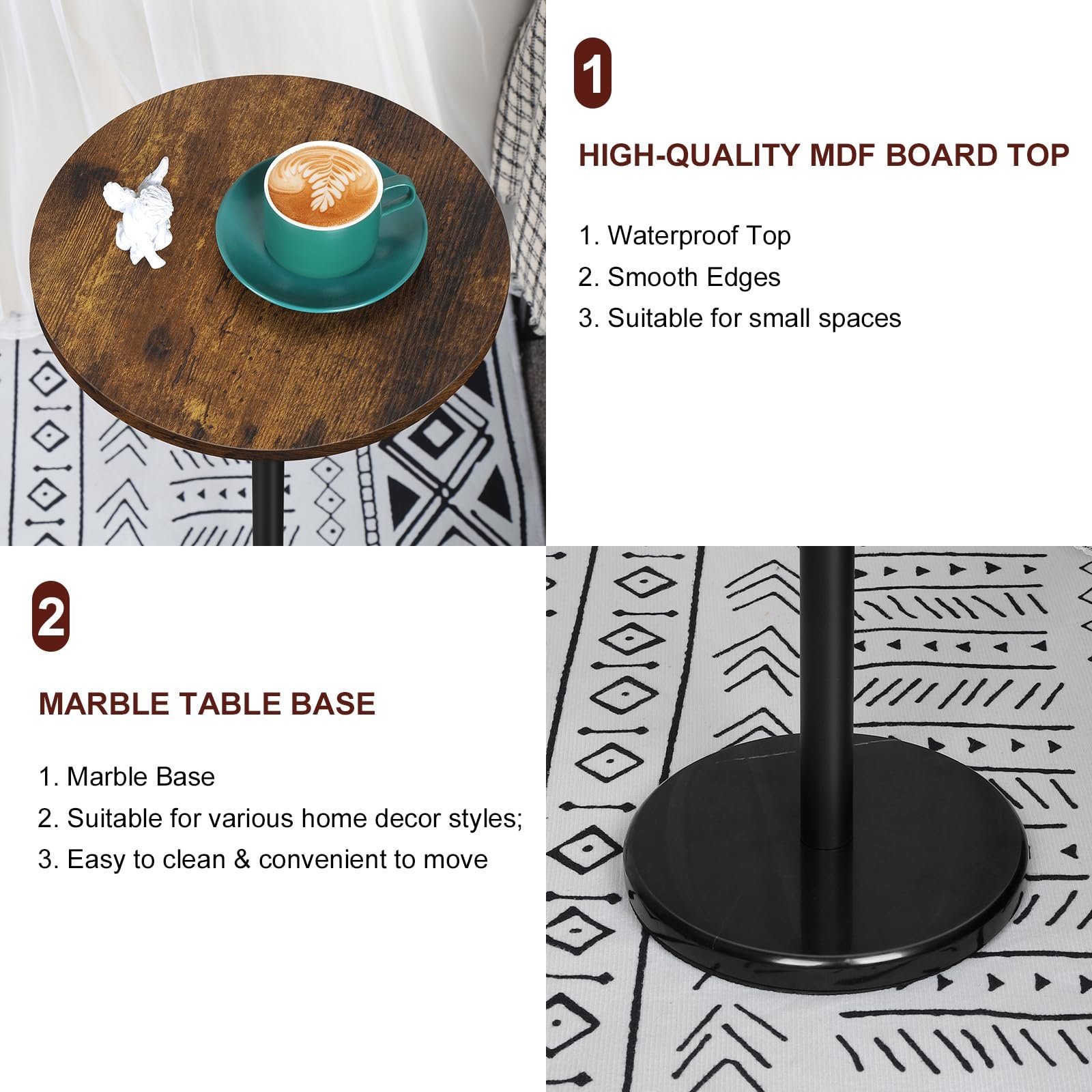 For indoor and outdoor use: the table top of the round side table is made of waterproof MDF wood. It is supported by a rust-proof metal frame and rests on a smooth marble base, which ensures easy cleaning and maintenance of the table. In addition, its versatile design allows it to complement different spaces such as patio, balcony or even bathroom.