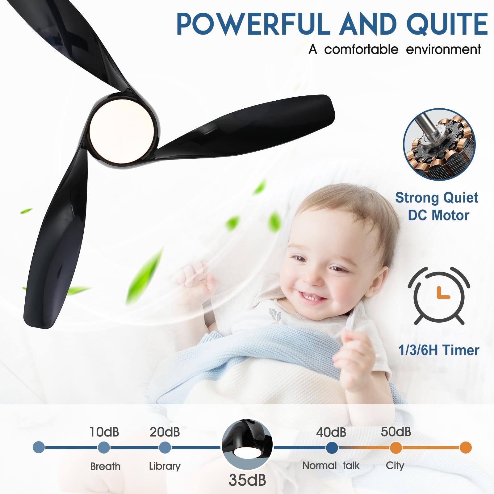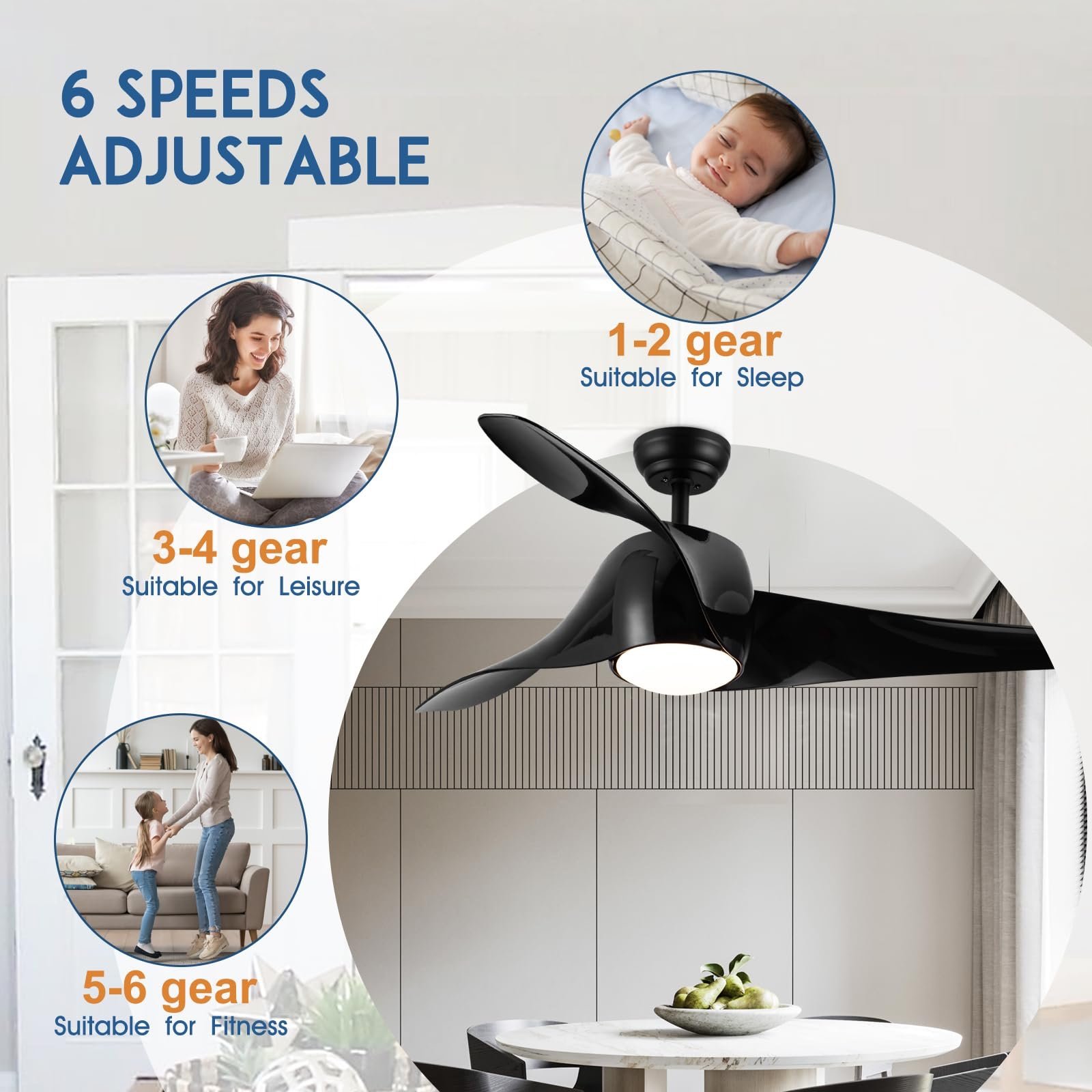 - 📱【 Quiet Reversible DC Motor】 SNJ DC motor made of pure copper wire, not only wind speed, quiet performance, and up to 10 years of life. and provides ultra-powerful airflow, moving the air downwards in summer for high speed cooling of the room, while the ceiling fan has a good airflow of over 6000 high cfm.And it can run in reverse in winter, allowing the air to flow upwards, helping to rotate the warm air in the room, evenly distributing it throughout the room. You can use it all year round.