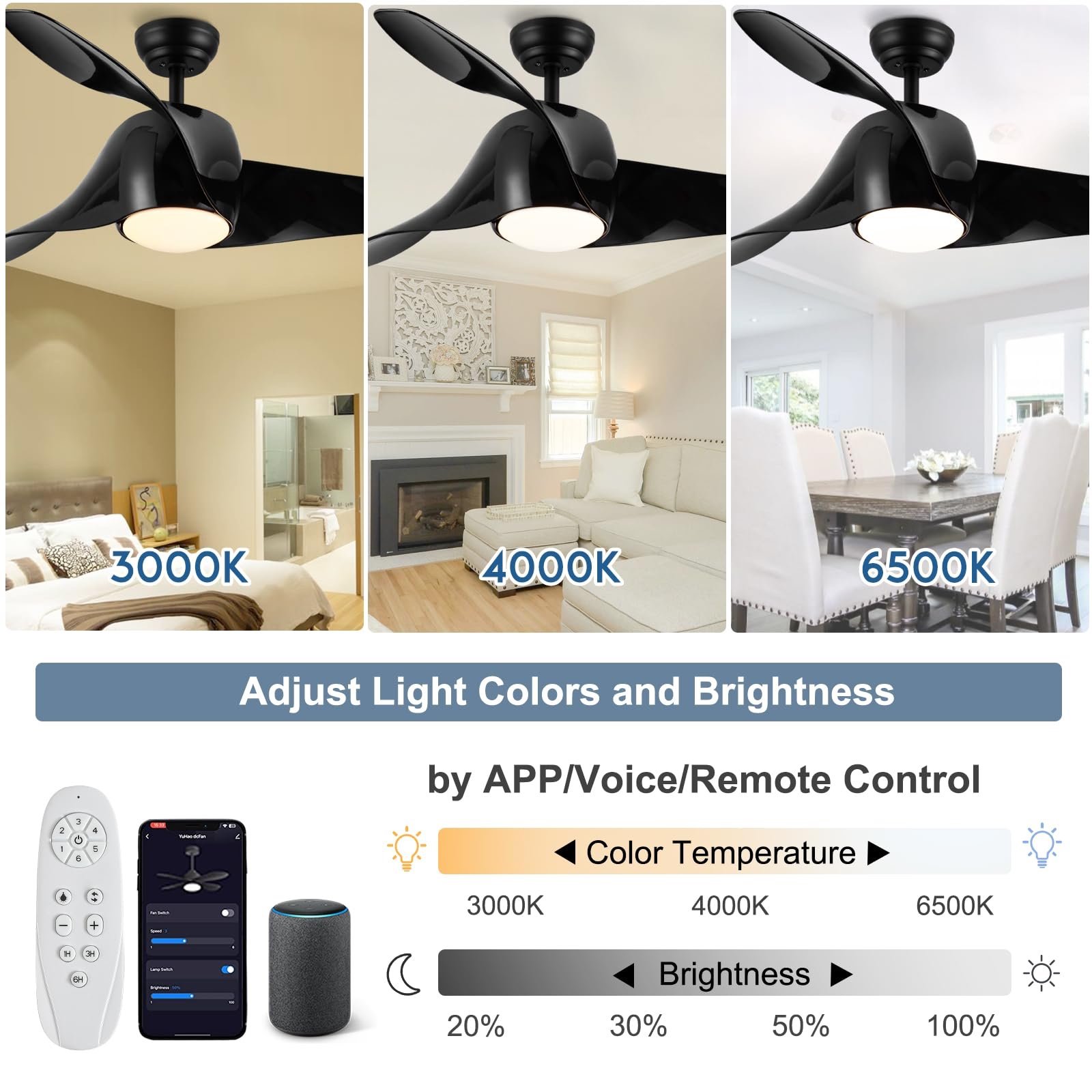 - 📱【 6 Wind Speeds & Customizable Light】You can easily control Reversible,Six wind speeds , Dimmable Tri-color temperatures LED (3000K warm yellow light for read/4000K natural light for amuse/6500K cool white light for meal) and Timer from anywhere in the room. The brightness is adjustable (20~100%).Fans or lights can work simultaneously or individually. Comes with battery and a remote control wall mount for easy access and placement of the remote control on the wall.