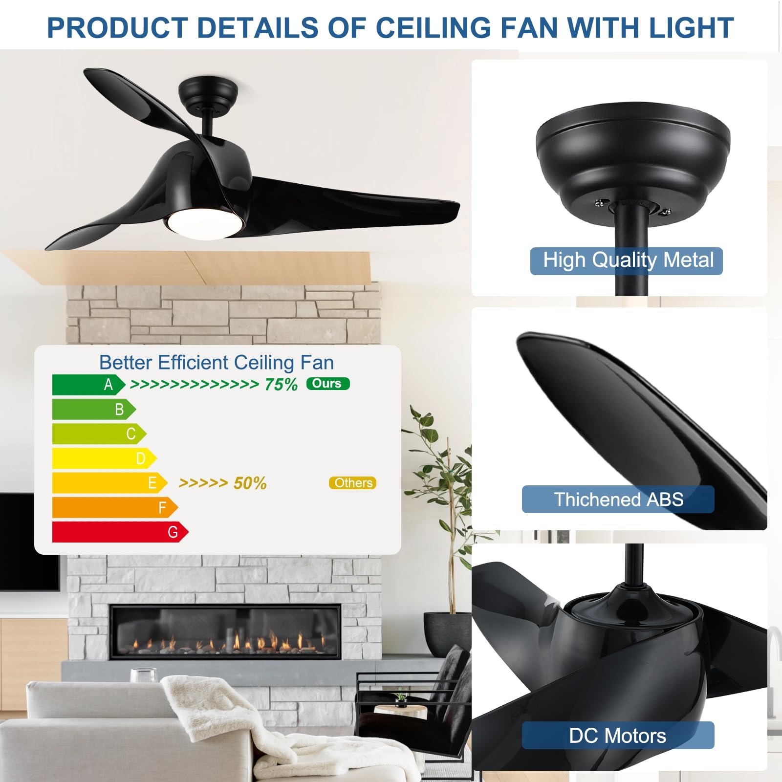 - 📱【 Decorate your home】The pure black matt body with wavy blades makes for a fashion and modern look.The high light transmittance opal frosted cover is paired with flicker-free LED lights to make the light softer and less glare. The design style of simple home decorators enhances the brightness and high-end feeling of your room.(52 inch 3 blades fan, which are designed for medium to large room such as a bedroom,kitchen,living room,dining room,hallway,garage, porch or common area indoor)