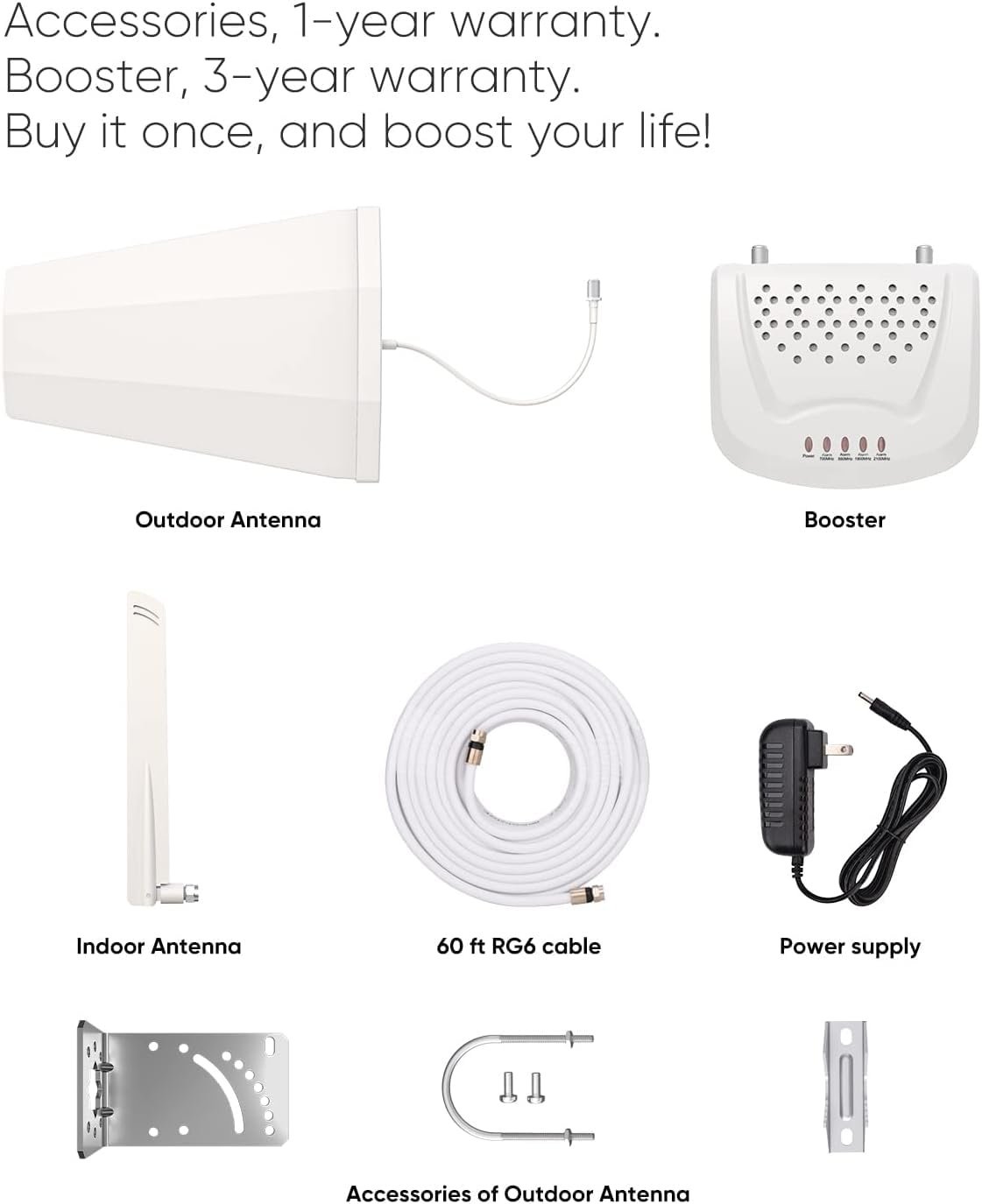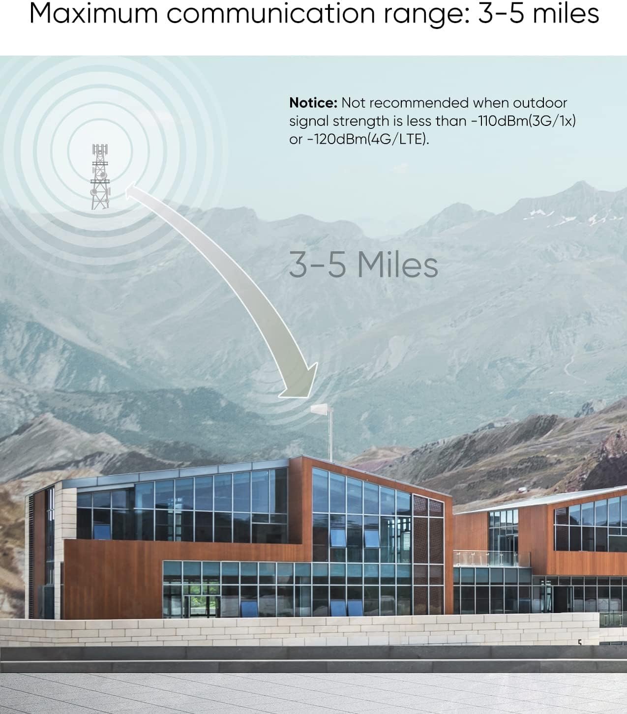 High Gain (60dB), Pick Up Weak Signal Over Long Distance, Maximum Communication Distance Range Up To 3~5 Miles. Enhances The Signal Up To 100X, With A Coverage Area Up to1,500 sq ft.(Note: coverage area range depends on the outdoor signal level: 1-2 bars (-100dBm) ~300 sq ft. , 3-4 bars (-90dBm) ~1,000 sq ft. , 5 bars (-80dBm) ~1,500 sq ft. ). Suitable For Remote Area.