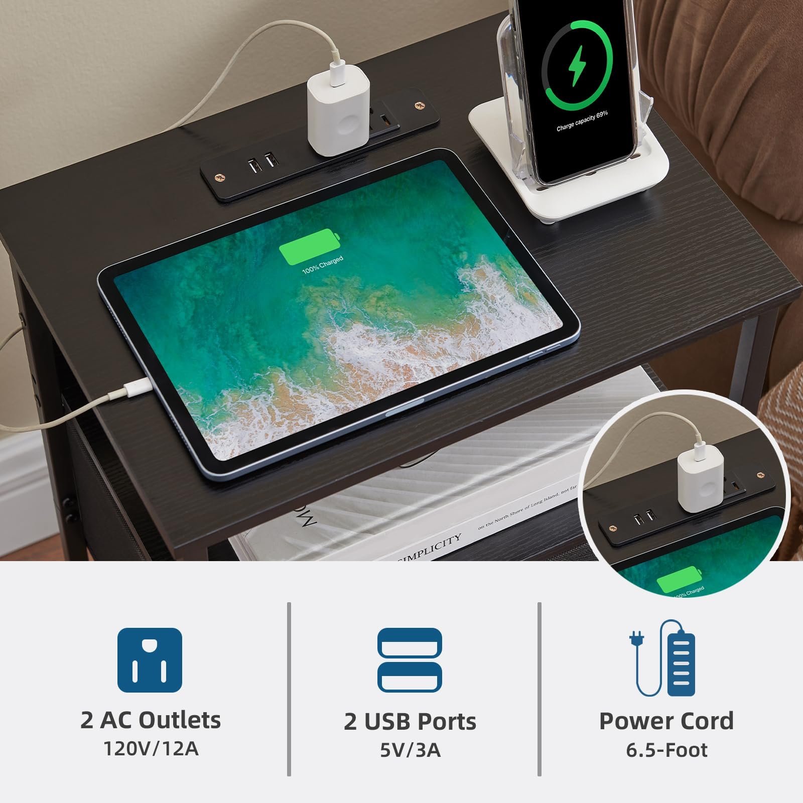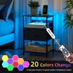 Multi-functional Storage: This nightstand serves as a charger and bedside table all in one with 2 USB ports, 2 standard sockets, 1 fabric drawers, and 2 open shelves for books or décor.