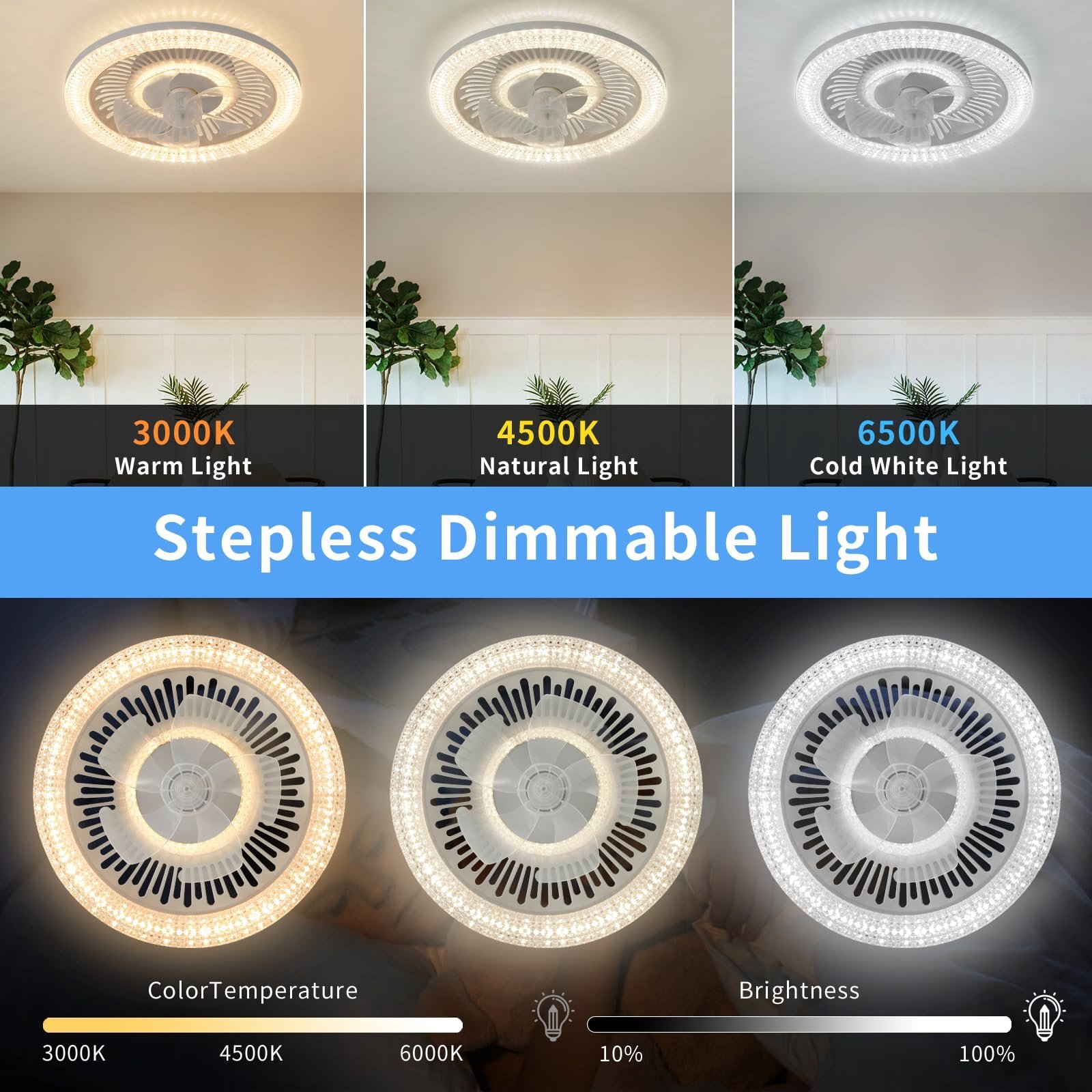 【3 Color Dimmable Light & Energy Saving】: The fan light has 3 different color temperature options (3000K warm light, 4500K medium white, and 6000K cool white), so you can choose the perfect atmosphere for any mood or occasion.In addition, the brightness can be adjusted from 10% to 100%.The energy-efficient LED light sources are not only environmentally friendly but also easy on the eyes. At the same time, the wind speed can be adjusted with 1-6 gears.