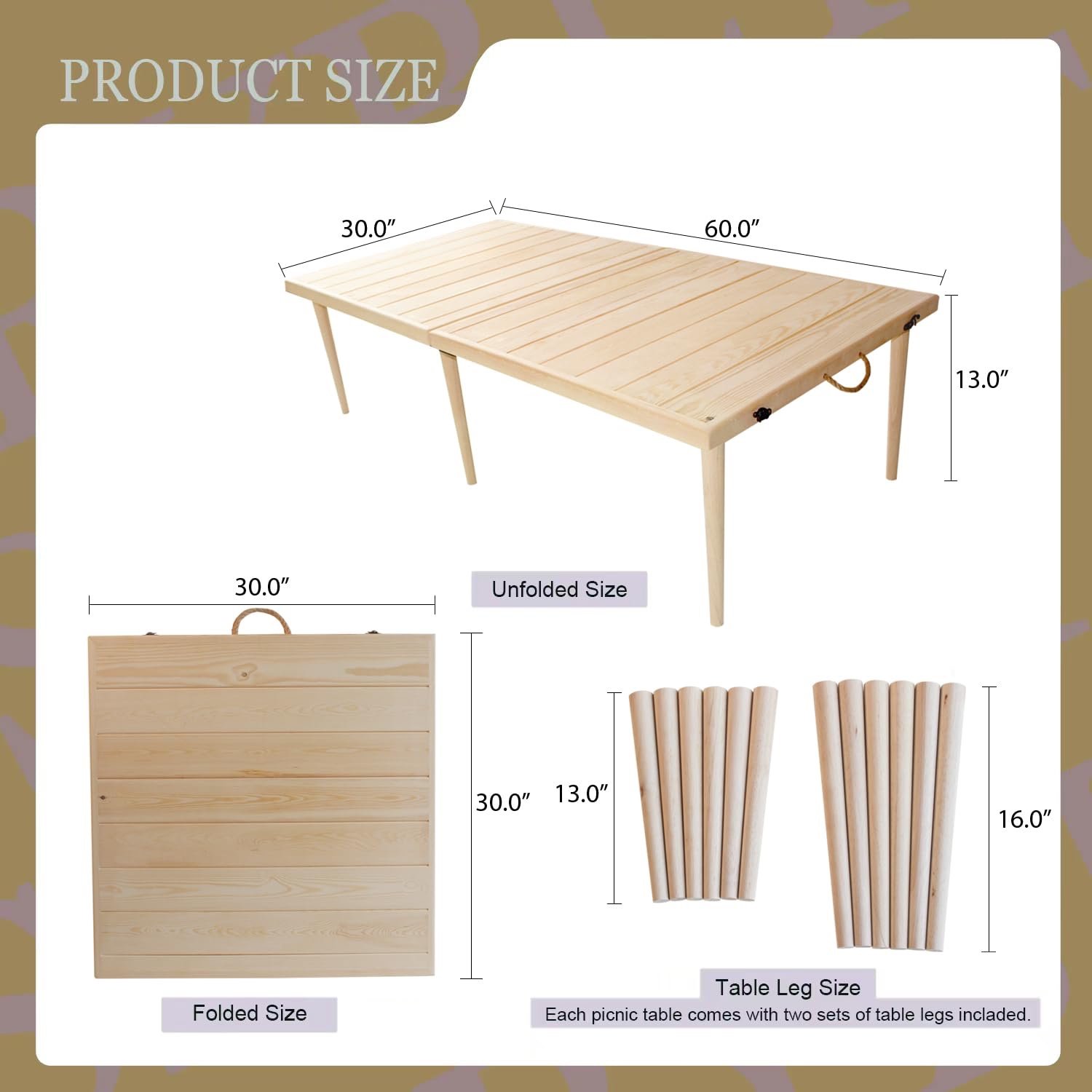 Spacious Tabletop & Two Legs Configuration: 🌷 The folded size is 30″ W x 30″ L, the unfolded size is 30″ W x 60″ L, spacious design can accommodate 6-8 people. 13″ and 16″ legs, you can choose the right height according to the usage scenarios, perfect for family dinners, friends gatherings and other multi-person events.