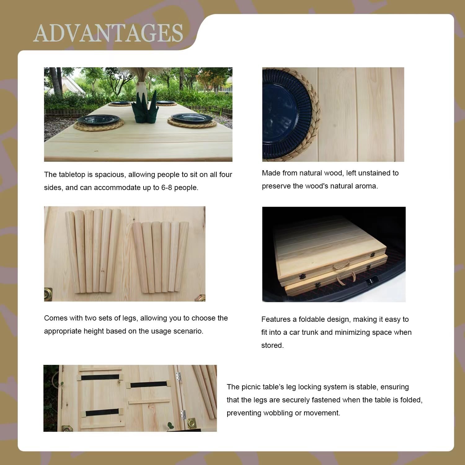 High-quality material: 🌷 Our folding picnic table is made of solid pine wood with natural wood grain and warm color tones, adding natural beauty. The rubber wood legs are of high density and hardness, ensuring excellent durability and stability, and are not easy to deform and crack during long-term use.
