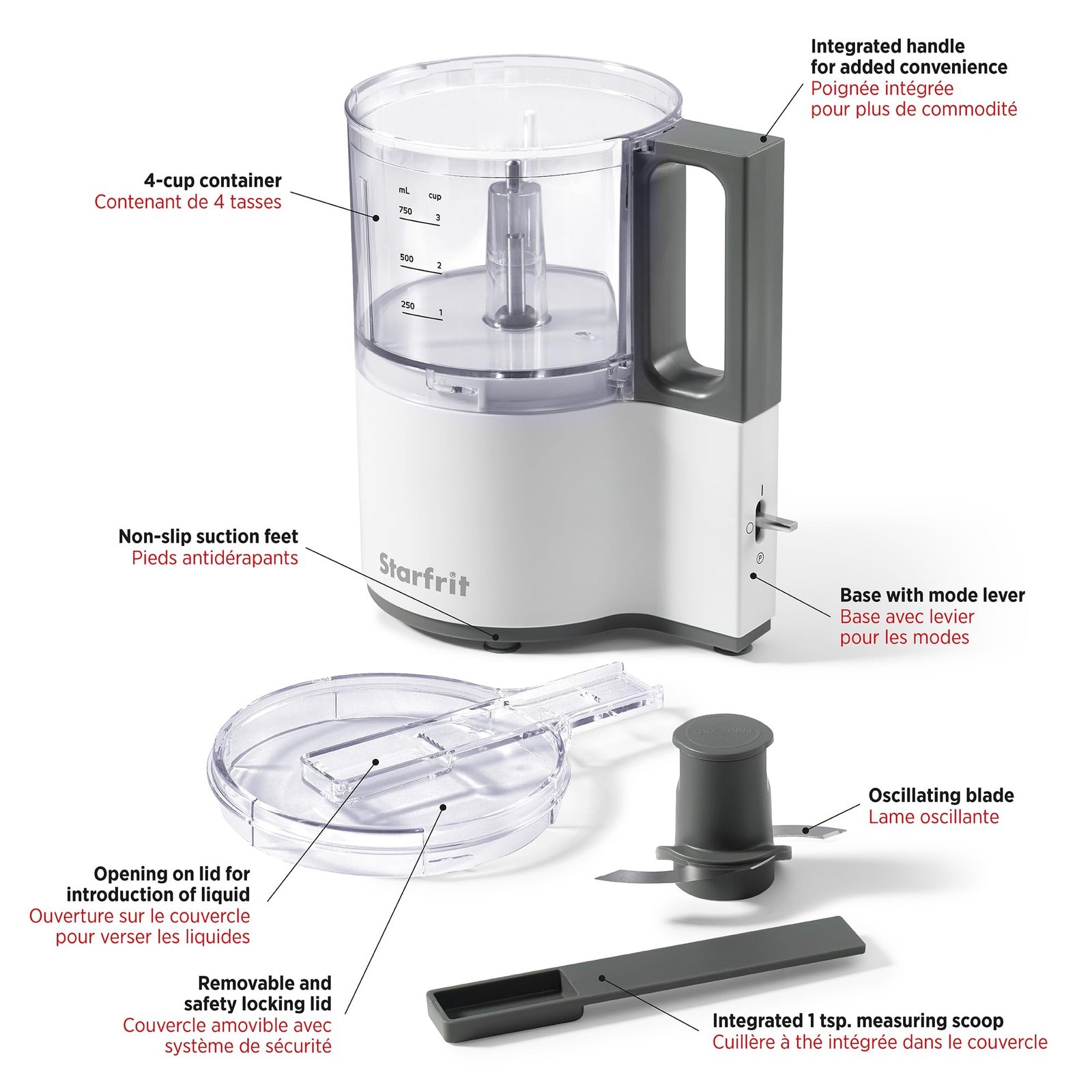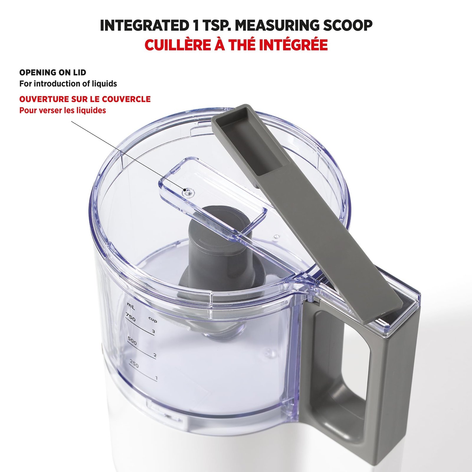 An integrated 1 tsp. measuring scoop adds precision to your ingredient measurements.