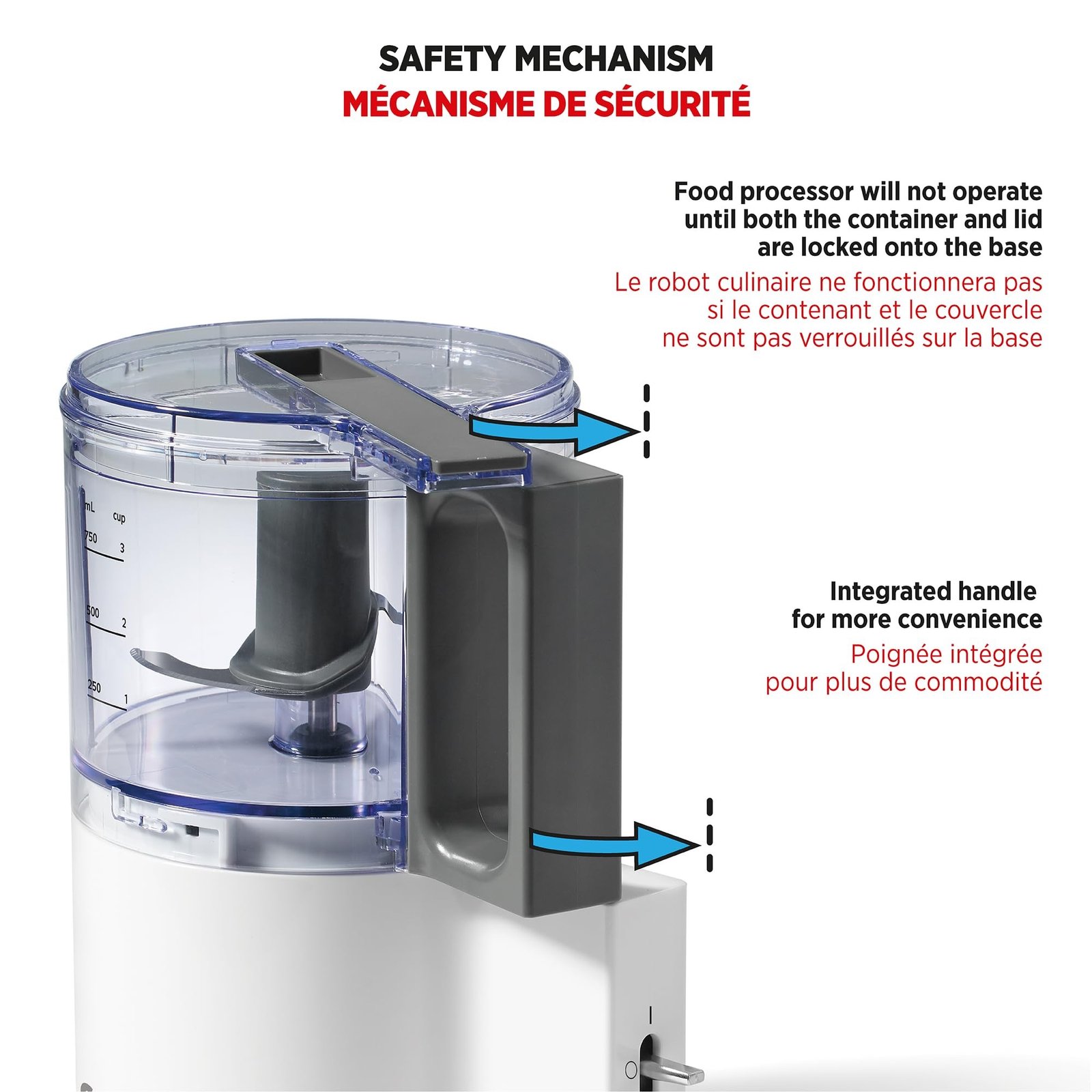 The integrated handle on the food processor provides added convenience and control during use.
