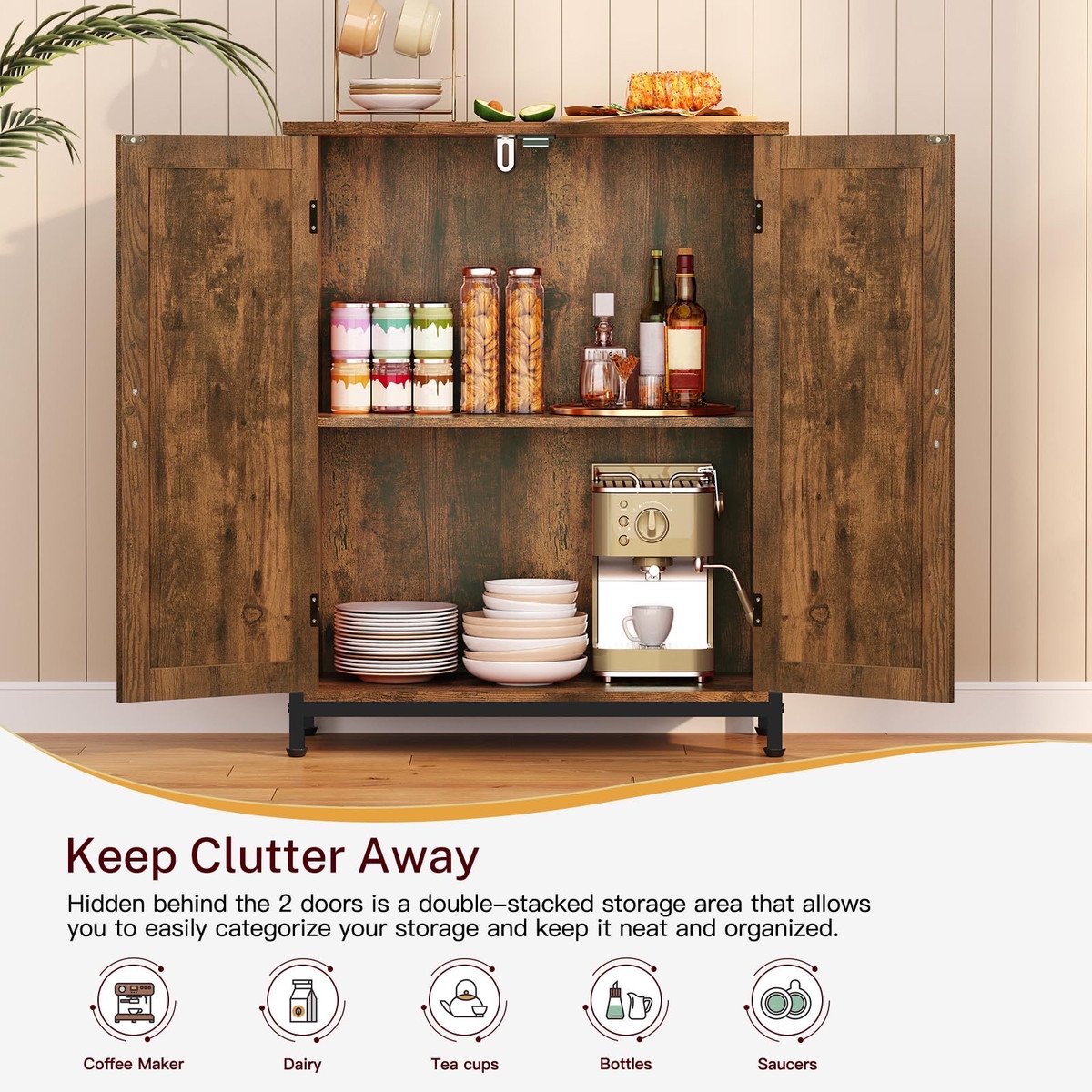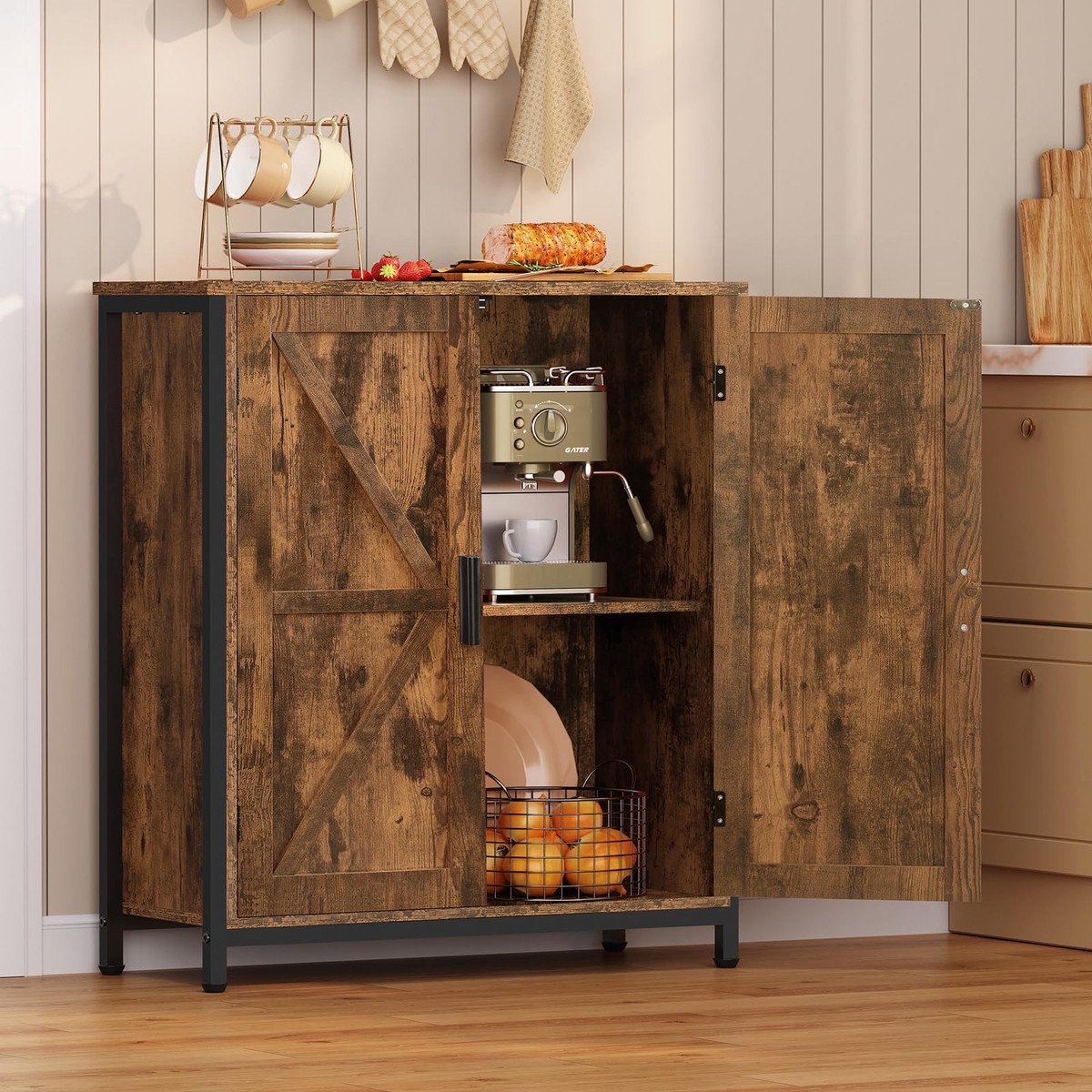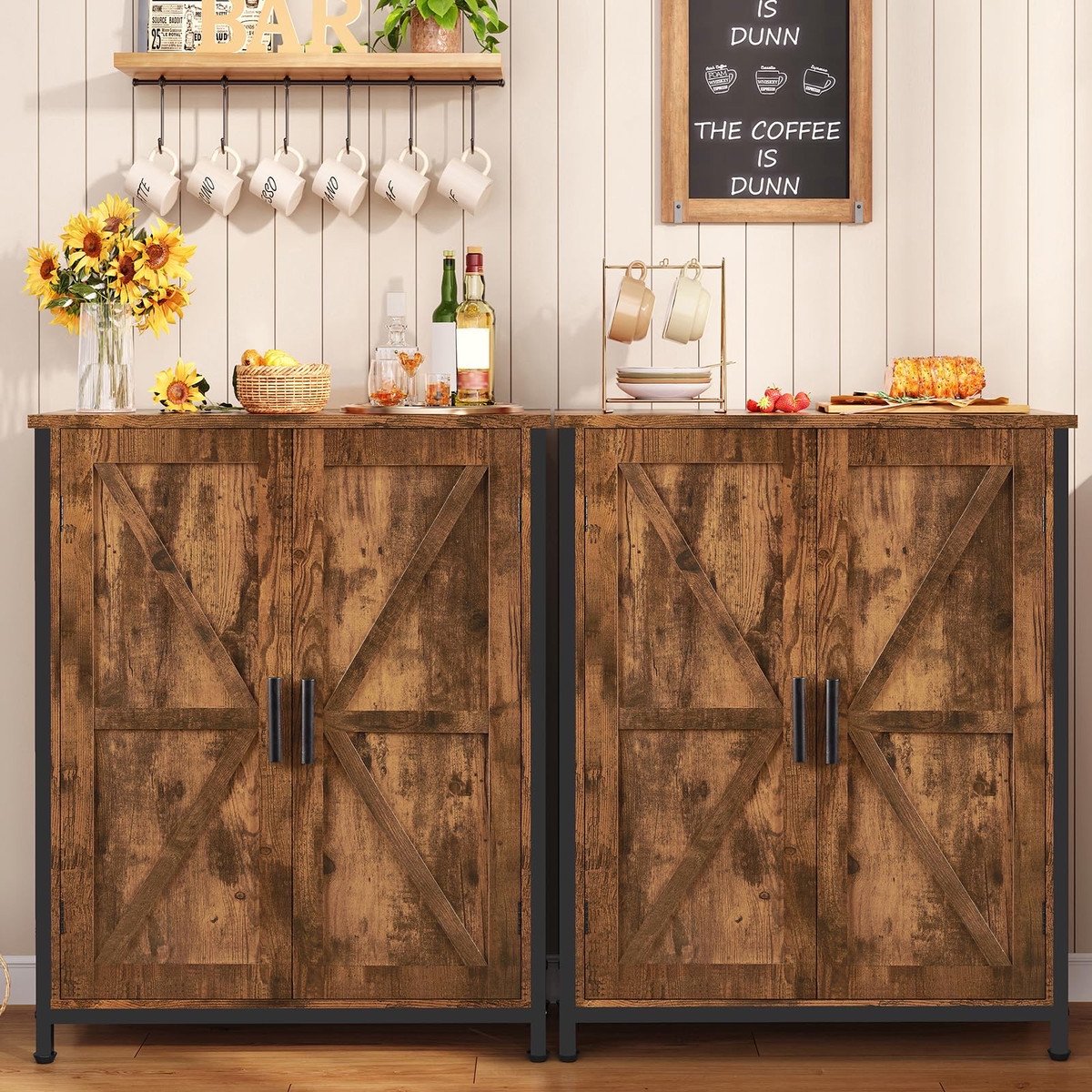 Enough Storage Space: In the spacious tabletop, you can put coffee makers, photo frames, and succulent plants. And the two large compartments behind the barn door are perfect for storing coffee mugs, air fryers, etc. that you don’t want on the counter