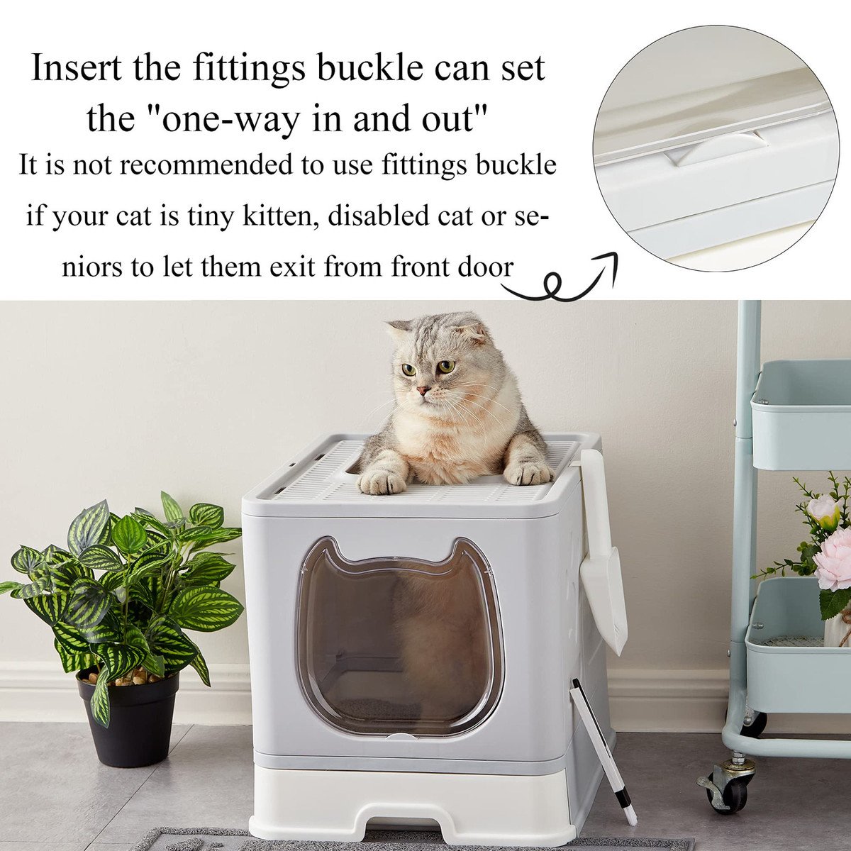 [SWITCH IN AND OUT MODE]-The front door can be set to only enter but not exit through inserting the fittings buckle that can contain litter scatter. It is not recommended to use fittings buckle if your cat is tiny kitten, disabled cat or seniors to let them exit from front door.