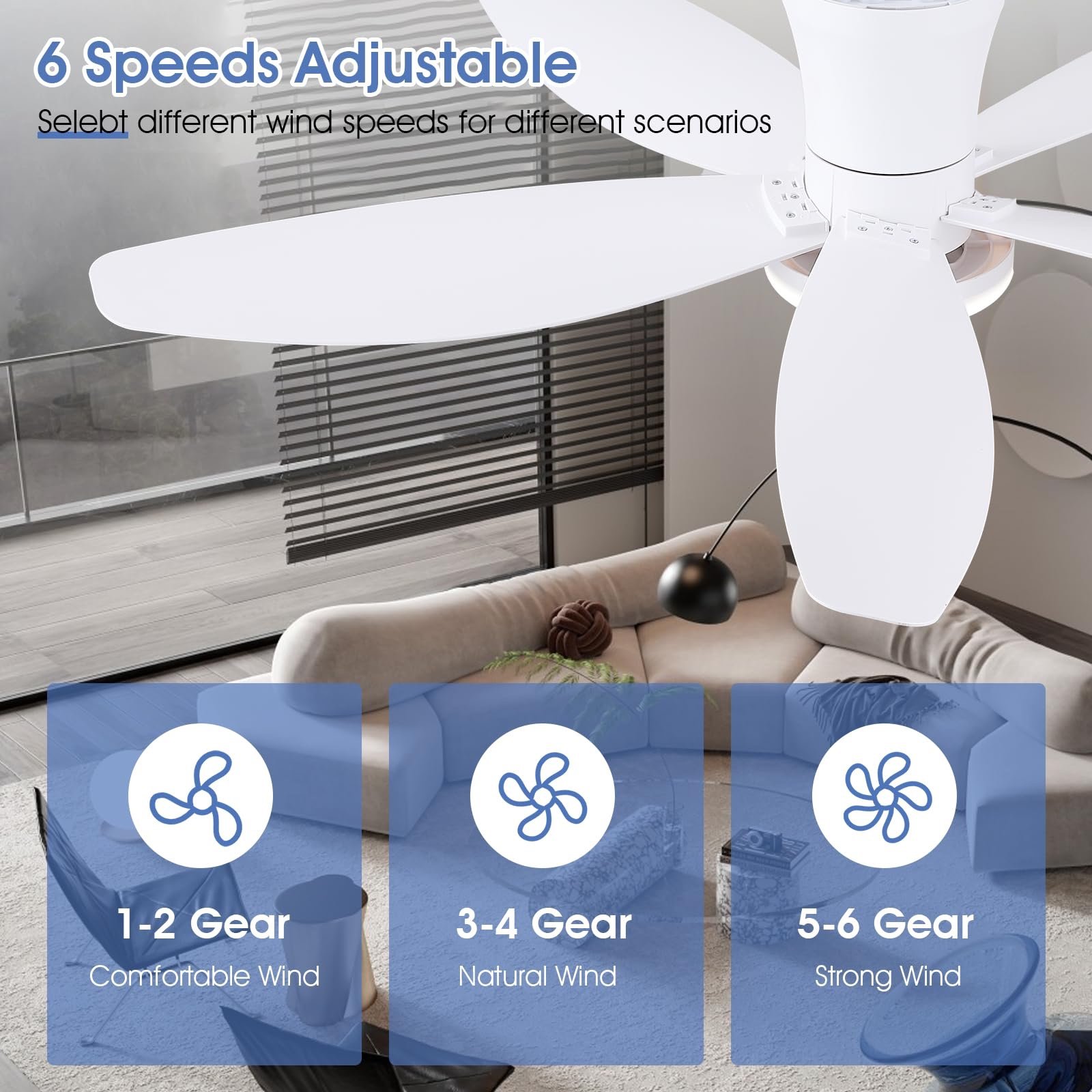 💡【Ceiling Fan with APP/Remote Control】:Enjoy the convenience of remote control and APP control,easy to operate.Adjust 6 kinds of wind speed,3 color lights and brightness,positive and reversible steering,2/4-hour timing!