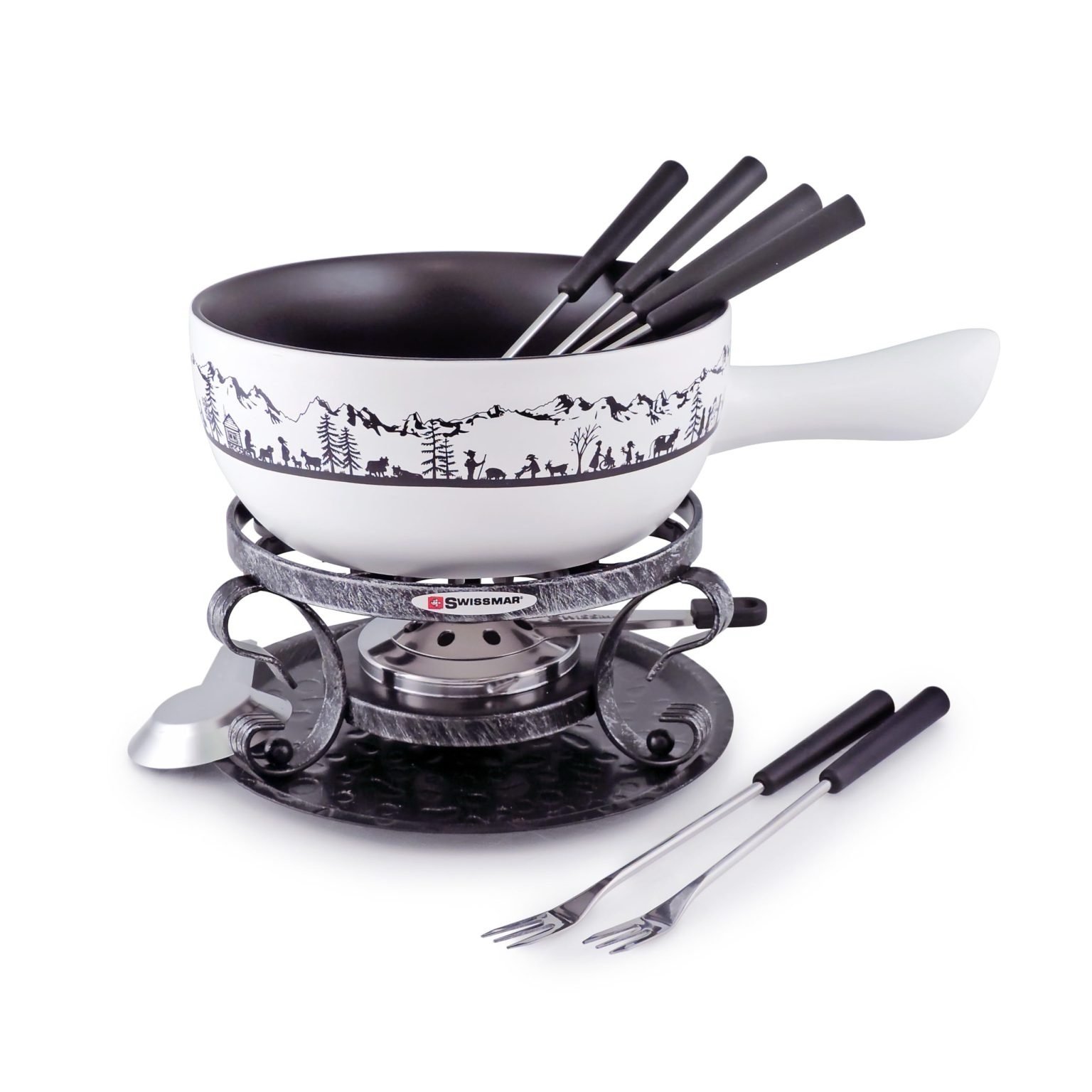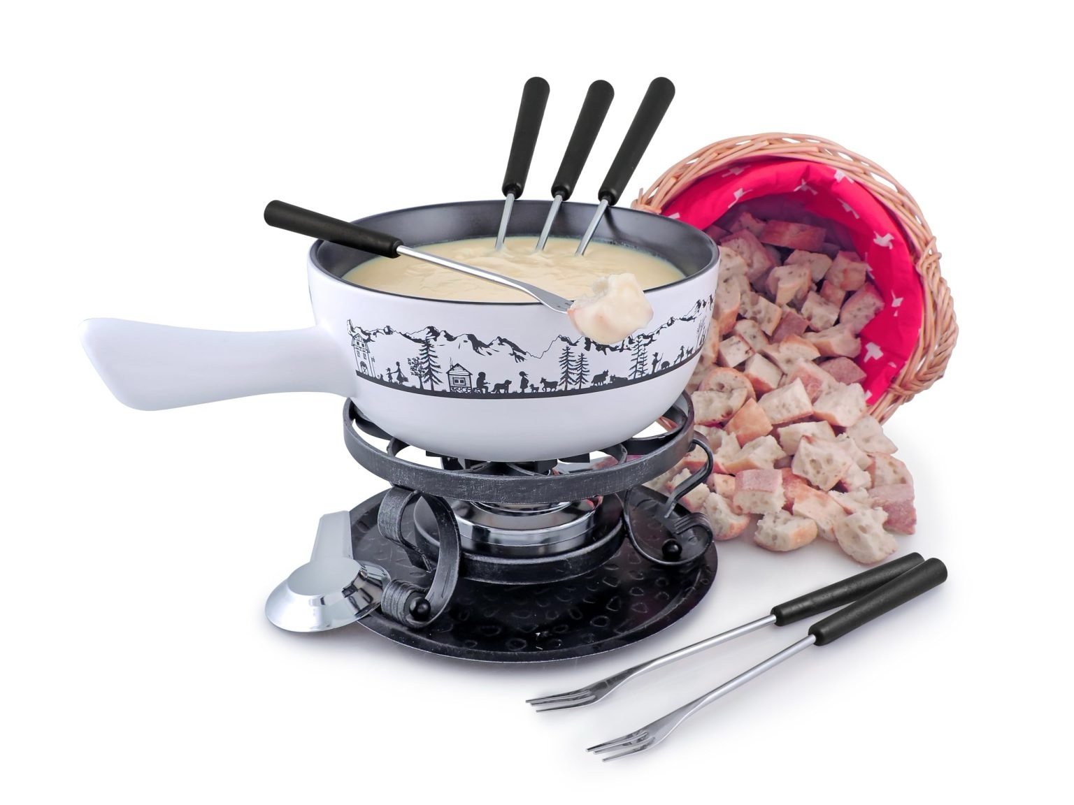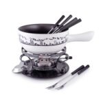 Complete 9-Piece Fondue Set – Includes a ceramic pot, six fondue forks, a sturdy wrought iron rechaud, and an 8-hole fondue burner for an authentic fondue experience. Perfect for family gatherings.
