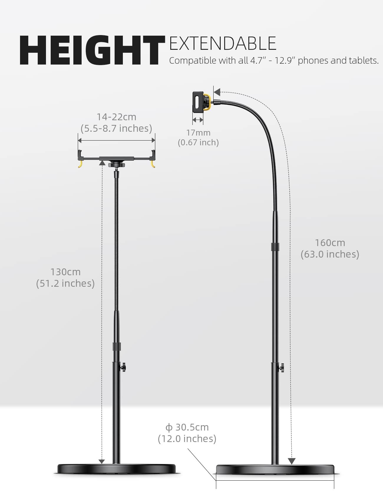 【Widely Compatibility】Upgrade clamp part of this tablet floor holder make it fits devices from 4.7 to 12.9 inches, including iPad Pro 9.7, 10.5, 11, 12.9, iPad Air, iPad mini 2 3 4, iPhone 11 Pro XS Max XR X 6 7 8 Plus, surface Pro, E-readers, Galaxy Tab, Pixel C, Nexus 7 9, Tab E 4, Fire HD.