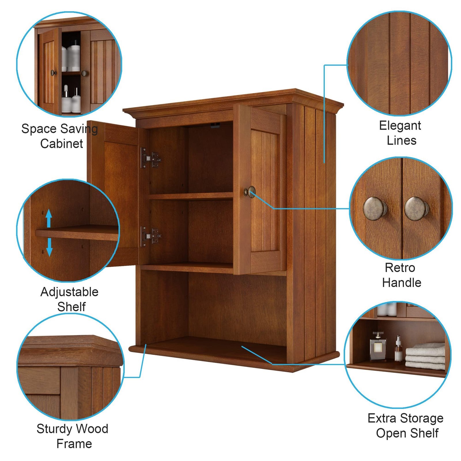 【Vintage and Classic Wall Cabinet】This bathroom cabinet has a wooden veneer which is safe to use and does not have a pungent paint smell. And its line modeling on the door and side panel adds beauty to your space