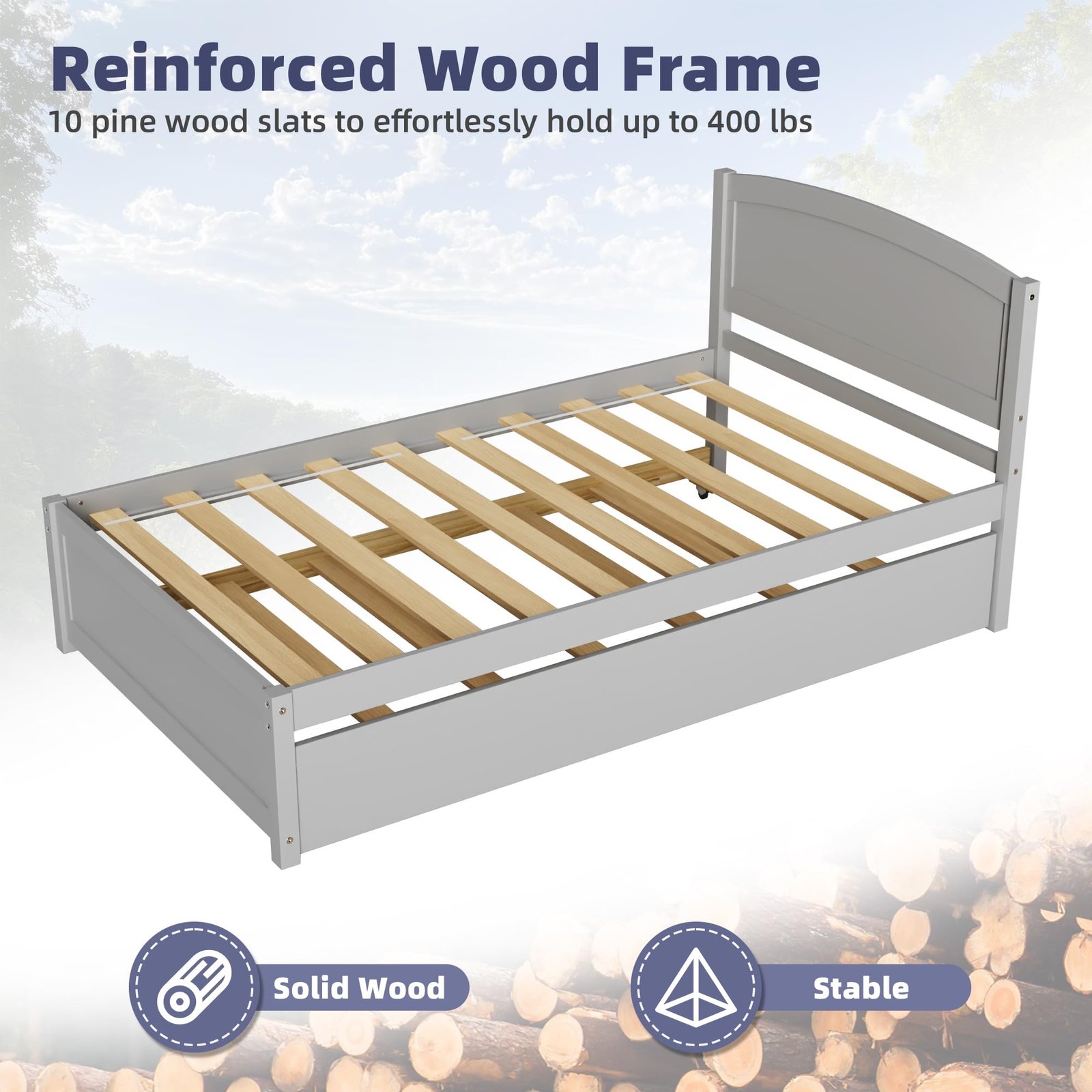 Solid Wood Structure:This twin trundle bed is made of solid nature pine wood and strengthen with 10+7 support slats. The solid wood structure provide a safe and cozy foundation to enjoy rest time. This bed can support 200 lbs and trundle bed can support 175lbs.