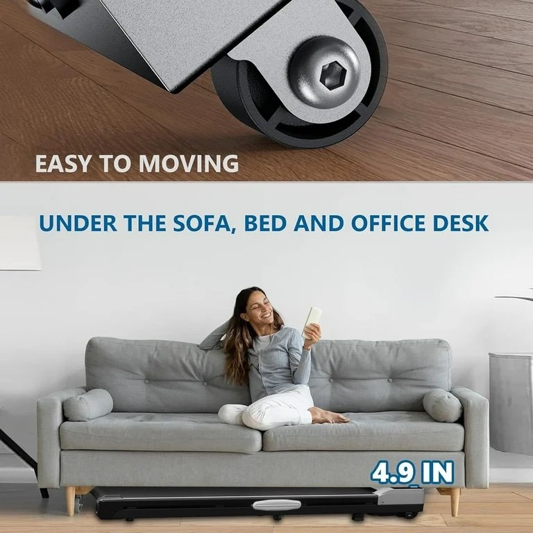 - Compact Treadmill for Easy Movement: The compact under desk treadmill is just 4.5 inches thick even with incline function, it is still very thin and light. The treadmill has two front wheels, allowing you to easily move and place it under a desk, bed, or sofa. Our under-desk treadmill requires no installation and is ready to use right out of the box.