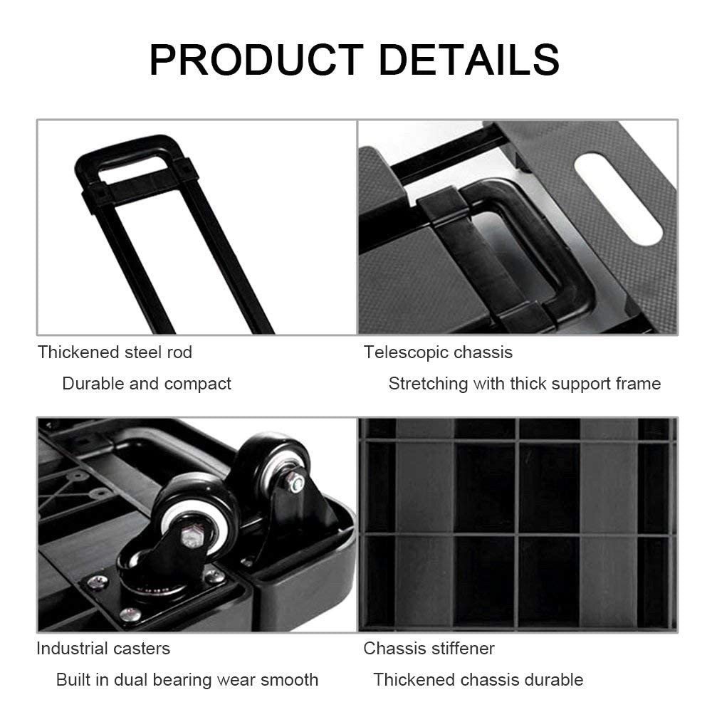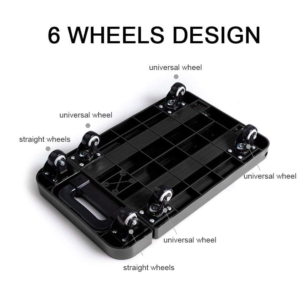 6 WHEELS DESIGN: 4 universal wheels, 2 straight wheels, it ensures flexibility, and increases the weight and stability of the load.