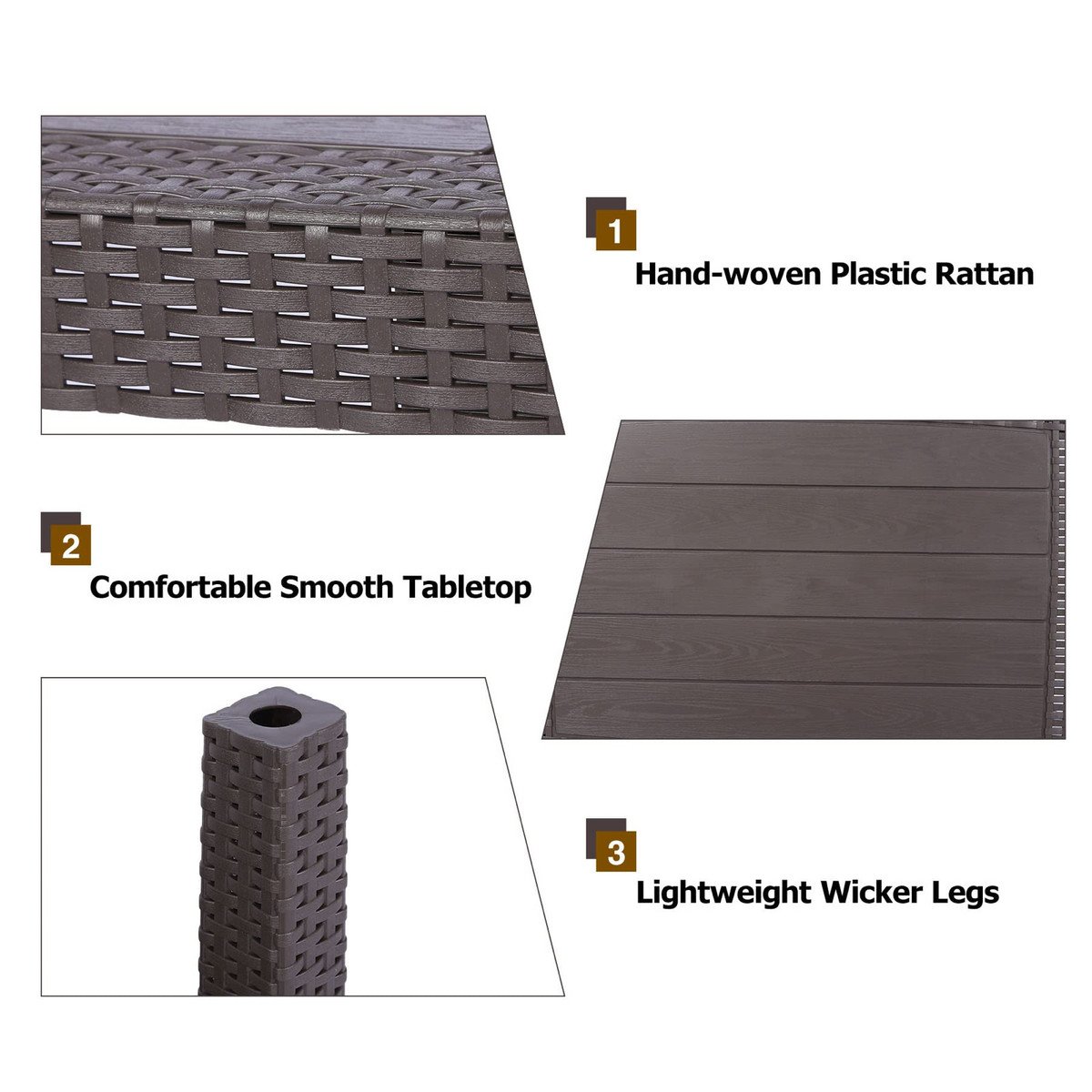 ?Exquisite & Portable?The wicker patio table is finished with exquisite design – smooth wood texture on the tabletop and hand-woven plastic rattan border. This table is easy to assemble and quick to disassemble in a few seconds, convenient to store or transport.