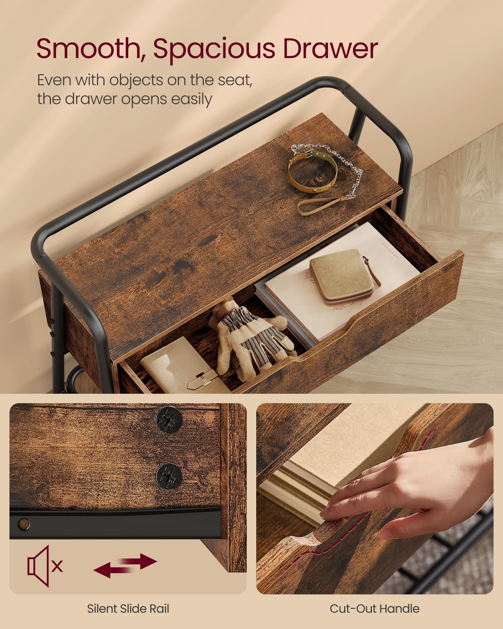 [Effortlessly Store and Access] With its cutout handle, this spacious drawer opens smoothly, providing easy access to your items. Keep your keys and wallets neatly stored, eliminating frantic morning searches