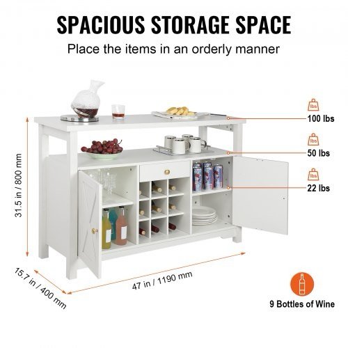 More Space for You: Measures 47×15.7×31.5 inches. This industrial bar cabinet can fit in various places and hold up to 222 lbs. That is a lot of weight! It has an open storage compartment, a wine rack, and hanging glass storage. Get ready to hold 9 wine bottles and several glasses for any special occasion. Cheers to you!