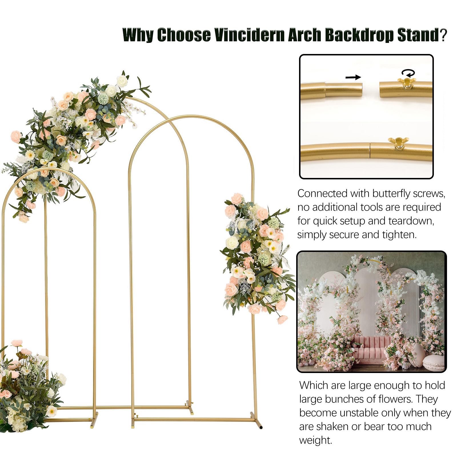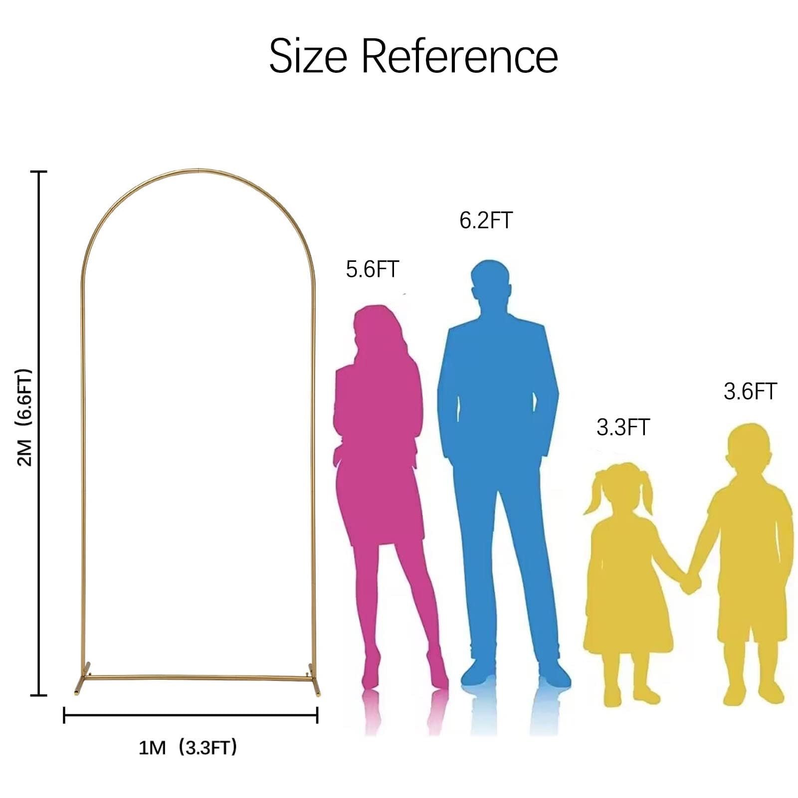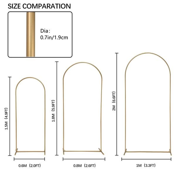 - [4.9FT x 5.9FT x 6.6FT Metal Arch Backdrop Stand]—Our metal arch backdrop stand is sold as a combination of three different sizes of metal arches. Three heights of 6.6FT, 5.9FT, and 4.9FT (flowers not included), The Color is light gold, faint gold, (Please allow some color difference with the product itself due to different monitors).