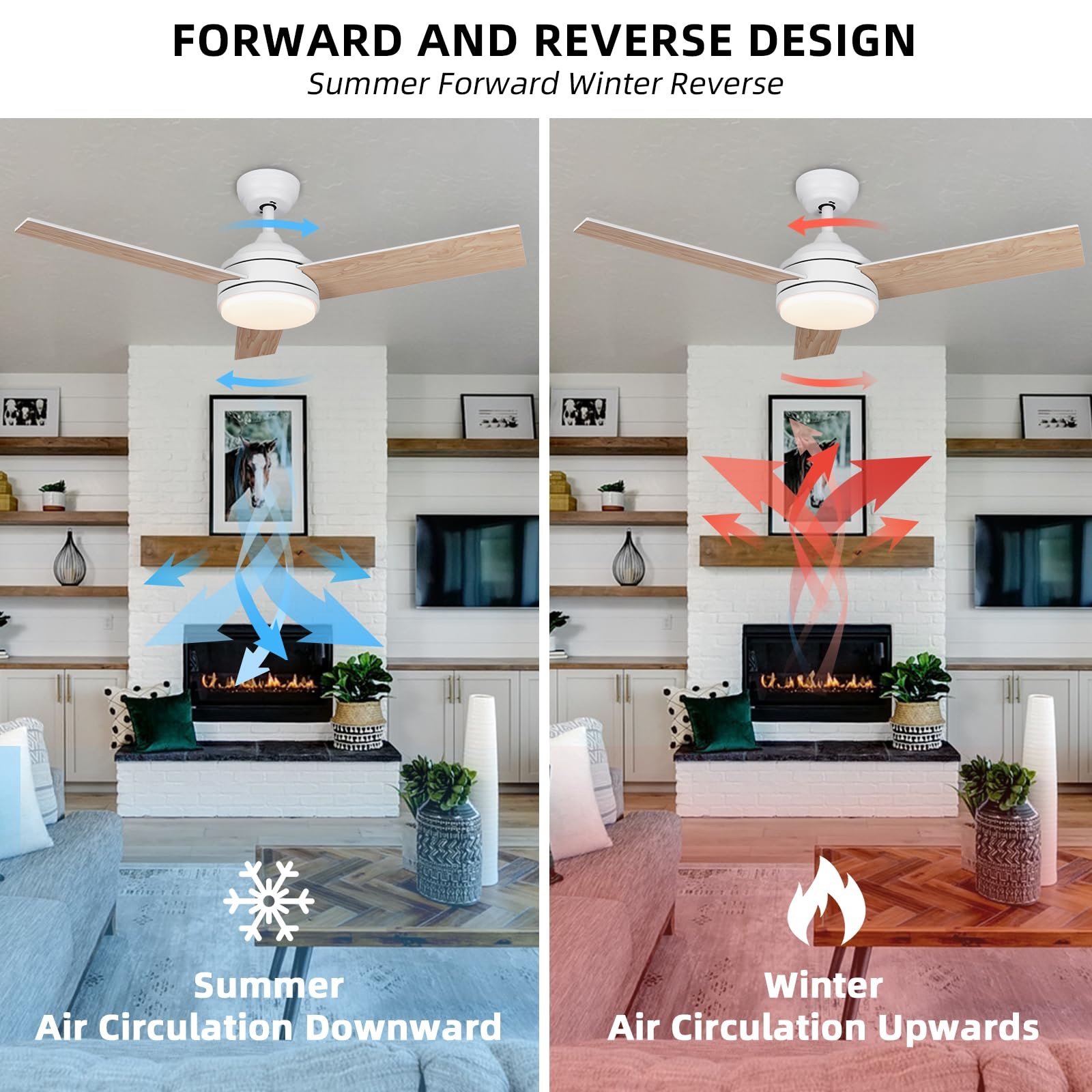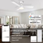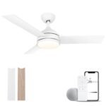 - 【Alexa Ceiling Fan with Light】: Smart ceiling fan with 3 wooden fan blades, one side of the fan blade is white and the other side is walnut color, you can install it according to your preference. Size: 42*42*12 inches (with 5″downrod), supports sloping ceilings. Ceiling fan moves a lot of air through 3928 CFM airflow. Modern ceiling fan with lights are perfect for decorating bedrooms, dining rooms, living rooms, kitchens, hallways, patios, etc