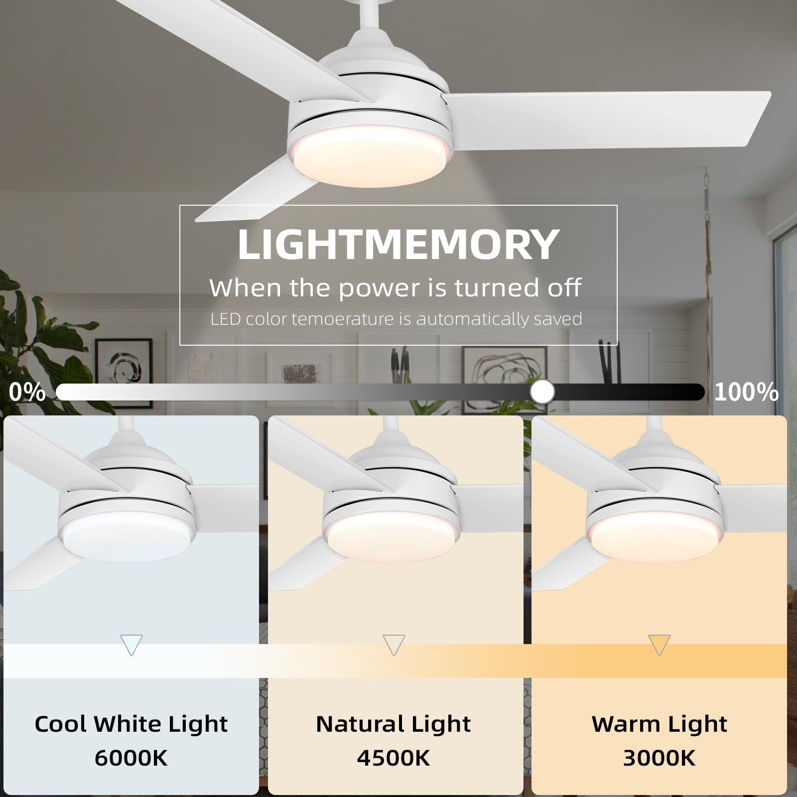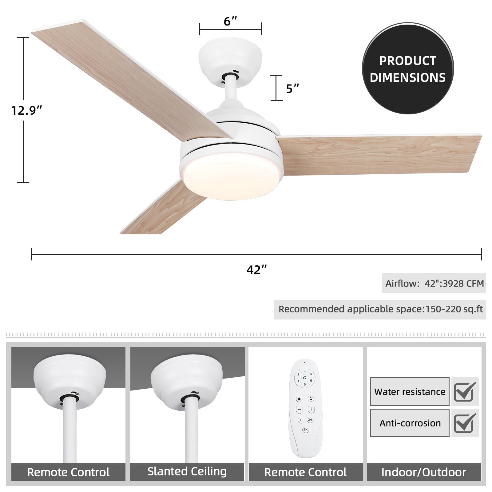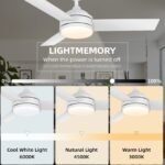 - 【Dimmable LED & Memory Function】: 42″ ceiling fan with 24W LED light kit, energy saving and longer life. The outdoor ceiling fan offers 3 adjustable color temperatures: cool white (6500K), natural white (4000K) and warm white (3000K), while you can adjust the brightness (0%-100%) with the remote control, perfect for a variety of scenarios such as party, work and sleep