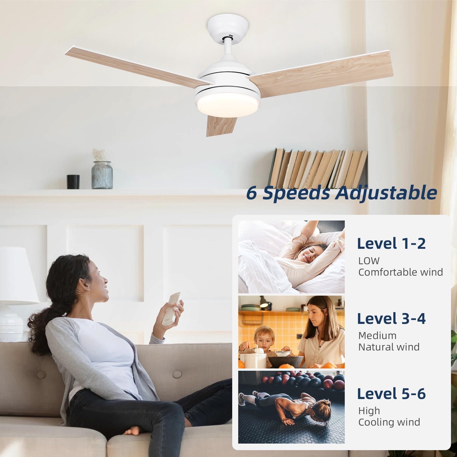 - 【6-Speed and Timing Function】: Bedroom ceiling fan with light has 6 wind speeds, press the (1-2-3-4-5-6) button to realize the wind speed adjustment. Press the (1H-3H-6H) button to achieve the timer off function. When you sleep at night, you can use the ceiling fan remote control to set the time for the fan to turn off. You can use the remote control to achieve all these functions