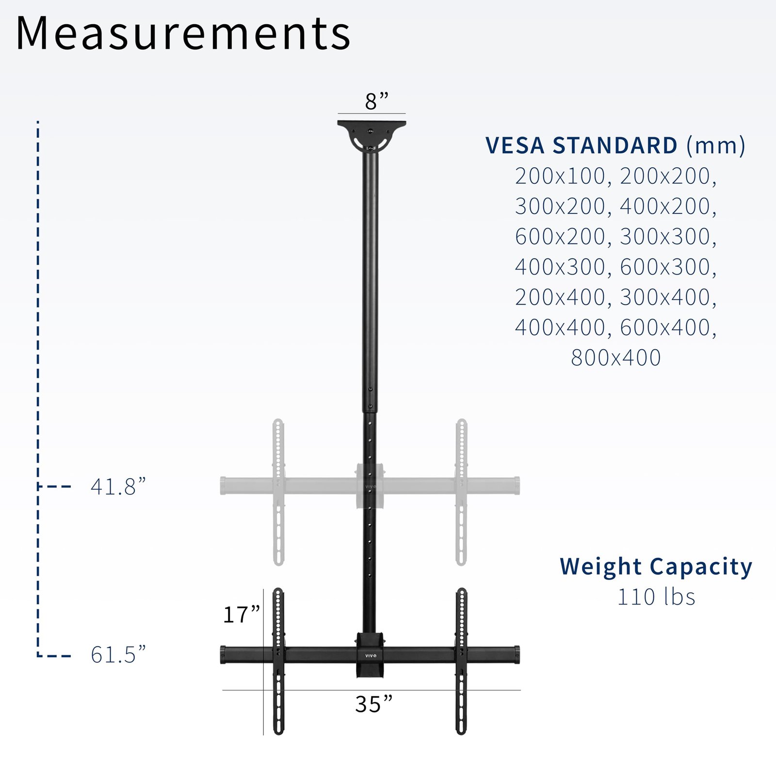 Fits 37” to 90” Screens: This 5ft extendable ceiling mount displays your 37” to 90” TV at a comfortable viewing height without occupying any wall or floor space. Fits VESA mounting patterns 200x100mm up to 800x400mm