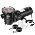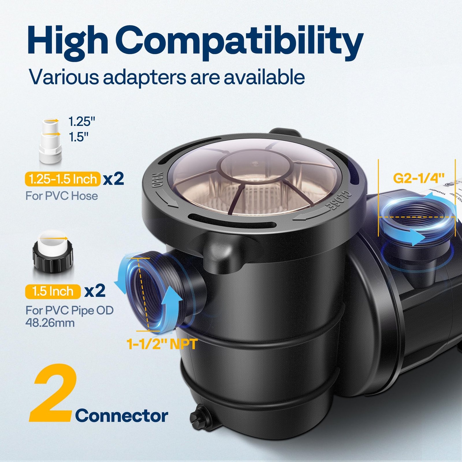WIDE APPLICATIONS – Female thread and slip union connection for tool-free installation; Suitable for swimming pools, hot tubs, thermal springs, spas and irrigation system, but should not to be used with storable pools; Package includes: 1 x pool pump; 2 x black fittings, 1 x manual