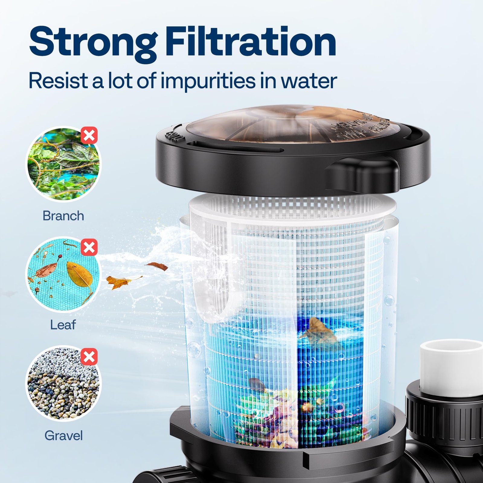 DETAIL ORIENTED – The strainer is designed with an extra-large filter basket that is detachable for easy cleaning; See -through lid allows you a clear internal viewing; Built-in automatic thermal overload protector and airflow ventilation protects from overheating and damage; Note: Please fill the pump with water upon first use to prevent the motor from overheating