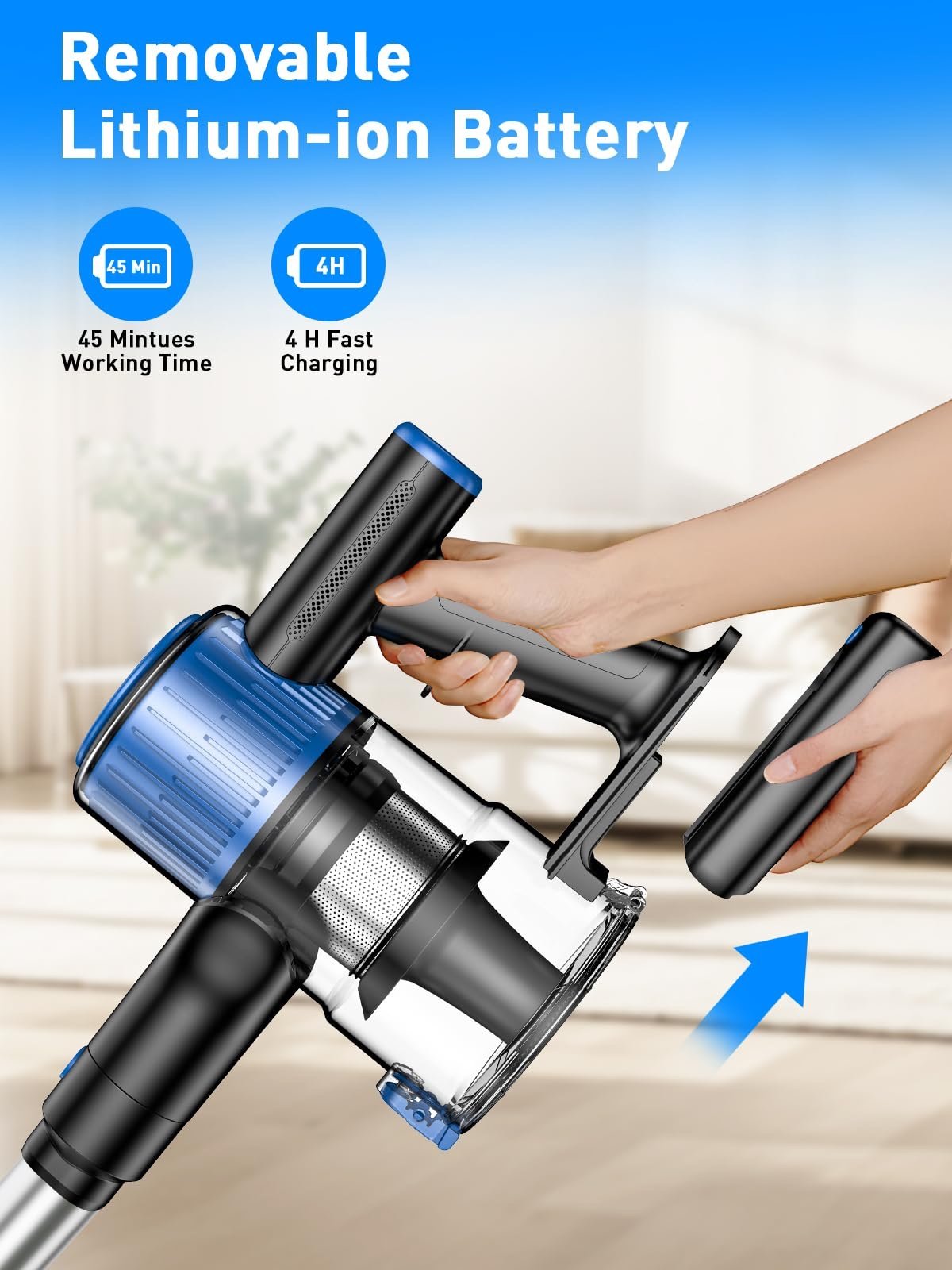 Powerful Suction for Efficient Cleaning: The Lightweight cordless vacuum cleaner boasts a strong 45Kpa suction power, achieving 99.7% cleaning performance on hardwood floors and tiles. Equipped with three suction modes, it can flexibly respond to different cleaning needs.