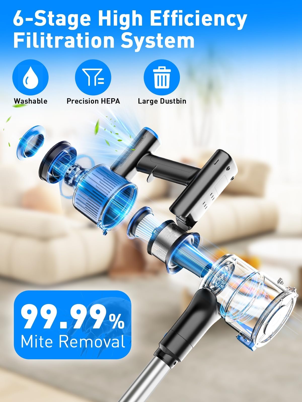 99.7% 6-Stage Filtration Prevents Re-Pollution: The wireless vacuum cleaner adopt the latest 6-stage filtration technology, which can ensure that 99.97% fine dust and garbage are filtered into the dust cup and release clean air. This cordless vacuum is very suitable for families with children and pets.