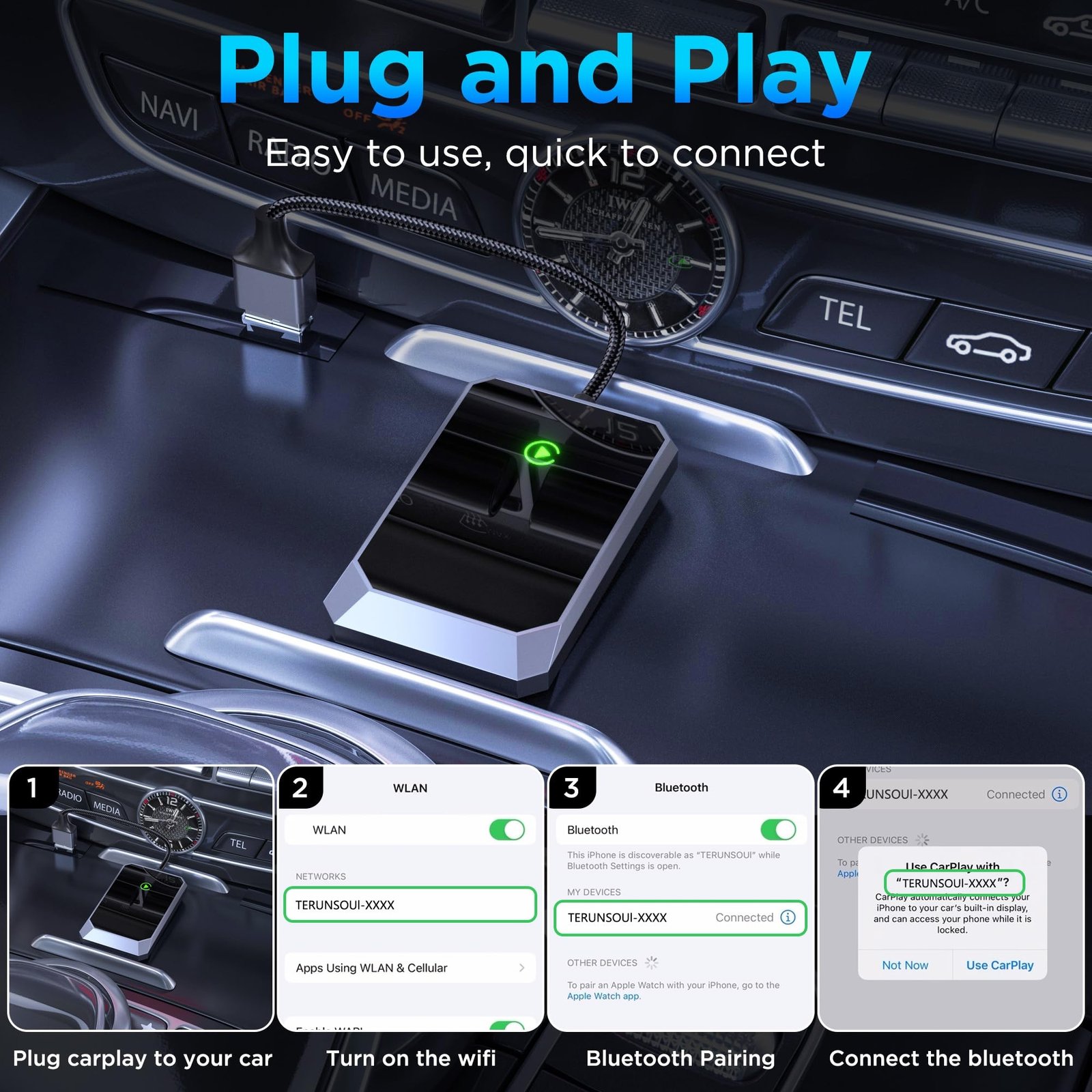 Effortless Plug-and-Play Connection: Ditch the hassle of tangled wires and embrace the convenience of wireless CarPlay. Simply plug our adapter into your car’s USB port, and it will automatically pair with your iPhone 10 or later device, ready to go in seconds. No waiting, no setup – just pure driving bliss.